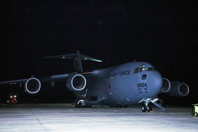 KENNEDY SPACE CENTER, FLA. - A U.S. Air Force C-17 cargo plane arrives at NASA Kennedy Space Center’s Shuttle Landing Facility. It is carrying the New Horizons spacecraft, as well as other equipment. After it is unloaded, the spacecraft will be transported to the Payload Hazardous Servicing Facility. New Horizons is designed to help us understand worlds at the edge of our solar system by making the first reconnaissance of Pluto and Charon - a 'double planet' and the last planet in our solar system to be visited by spacecraft. The mission will then visit one or more objects in the Kuiper Belt region beyond Neptune. New Horizons is scheduled to launch in January 2006, swing past Jupiter for a gravity boost and scientific studies in February or March 2007, and reach Pluto and its moon, Charon, in July 2015.