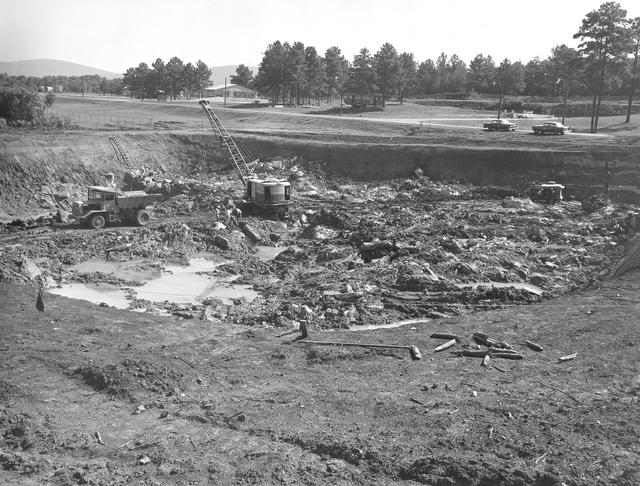 At its founding, the Marshall Space Flight Center (MSFC) inherited the Army’s Jupiter and Redstone test stands, but much larger facilities were needed for the giant stages of the Saturn V. From 1960 to 1964, the existing stands were remodeled and a sizable new test area was developed. The new comprehensive test complex for propulsion and structural dynamics was unique within the nation and the free world, and they remain so today because they were constructed with foresight to meet the future as well as on going needs. Construction of the S-IC Static test stand complex began in 1961 in the west test area of MSFC, and was completed in 1964. The S-IC static test stand was designed to develop and test the 138-ft long and 33-ft diameter Saturn V S-IC first stage, or booster stage, weighing in at 280,000 pounds. Required to hold down the brute force of a 7,500,000-pound thrust produced by 5 F-1 engines, the S-IC static test stand was designed and constructed with the strength of hundreds of tons of steel and 12,000,000 pounds of cement, planted down to bedrock 40 feet below ground level. The foundation walls, constructed with concrete and steel, are 4 feet thick. The base structure consists of four towers with 40-foot-thick walls extending upward 144 feet above ground level. The structure was topped by a crane with a 135-foot boom. With the boom in the upright position, the stand was given an overall height of 405 feet, placing it among the highest structures in Alabama at the time. In this photo, taken July 31, 1961, work is continued in the clearing of the test stand site.