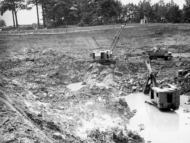 At its founding, the Marshall Space Flight Center (MSFC) inherited the Army’s Jupiter and Redstone test stands, but much larger facilities were needed for the giant stages of the Saturn V. From 1960 to 1964, the existing stands were remodeled and a sizable new test area was developed. The new comprehensive test complex for propulsion and structural dynamics was unique within the nation and the free world, and they remain so today because they were constructed with foresight to meet the future as well as on going needs. Construction of the S-IC Static test stand complex began in 1961 in the west test area of MSFC, and was completed in 1964. The S-IC static test stand was designed to develop and test the 138-ft long and 33-ft diameter Saturn V S-IC first stage, or booster stage, weighing in at 280,000 pounds. Required to hold down the brute force of a 7,500,000-pound thrust produced by 5 F-1 engines, the S-IC static test stand was designed and constructed with the strength of hundreds of tons of steel and 12,000,000 pounds of cement, planted down to bedrock 40 feet below ground level. The foundation walls, constructed with concrete and steel, are 4 feet thick. The base structure consists of four towers with 40-foot-thick walls extending upward 144 feet above ground level. The structure was topped by a crane with a 135-foot boom. With the boom in the upright position, the stand was given an overall height of 405 feet, placing it among the highest structures in Alabama at the time. In this photograph taken on August 5th, 1961, a back hoe is nearly submerged in water in the test stand site. During the initial digging, the disturbance of a natural spring contributed to constant water problems during the construction process. It was necessary to pump the water from the site on a daily basis and is still pumped from the site today.