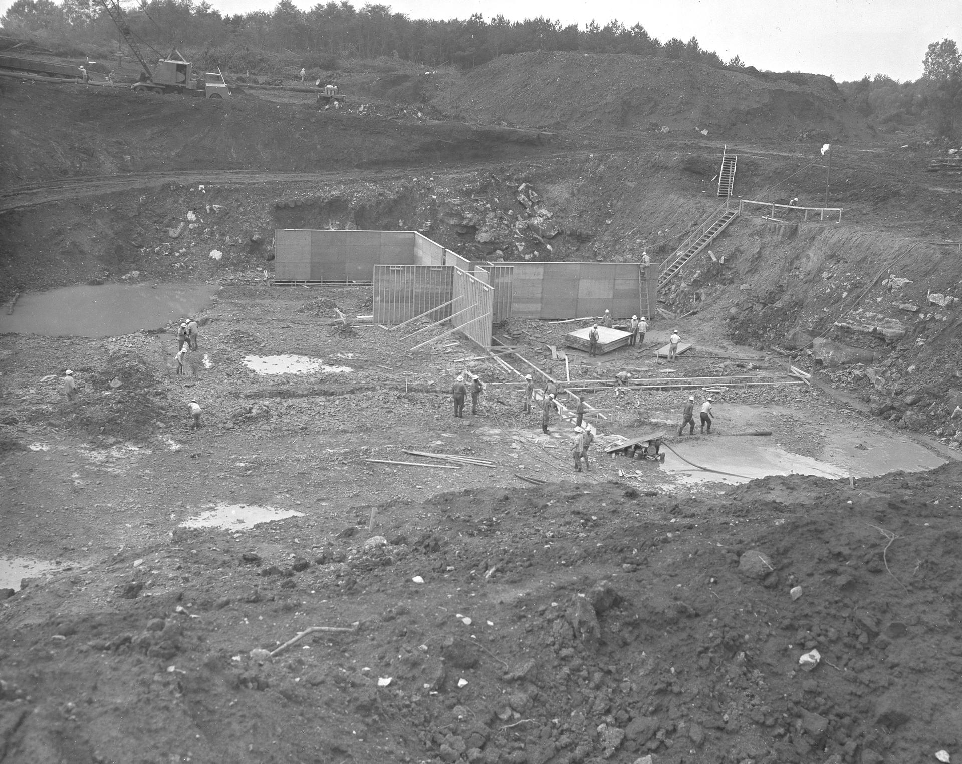 At its founding, the Marshall Space Flight Center (MSFC) inherited the Army’s Jupiter and Redstone test stands, but much larger facilities were needed for the giant stages of the Saturn V. From 1960 to 1964, the existing stands were remodeled and a sizable new test area was developed. The new comprehensive test complex for propulsion and structural dynamics was unique within the nation and the free world, and they remain so today because they were constructed with foresight to meet the future as well as on going needs. Construction of the S-IC Static test stand complex began in 1961 in the west test area of MSFC, and was completed in 1964. The S-IC static test stand was designed to develop and test the 138-ft long and 33-ft diameter Saturn V S-IC first stage, or booster stage, weighing in at 280,000 pounds. Required to hold down the brute force of a 7,500,000-pound thrust produced by 5 F-1 engines, the S-IC static test stand was designed and constructed with the strength of hundreds of tons of steel and 12,000,000 pounds of cement, planted down to bedrock 40 feet below ground level. The foundation walls, constructed with concrete and steel, are 4 feet thick. The base structure consists of four towers with 40-foot-thick walls extending upward 144 feet above ground level. The structure was topped by a crane with a 135-foot boom. With the boom in the upright position, the stand was given an overall height of 405 feet, placing it among the highest structures in Alabama at the time. This photo, taken September 1, 1961, shows the construction of forms which became the concrete foundation for the massive stand.