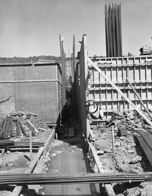 At its founding, the Marshall Space Flight Center (MSFC) inherited the Army’s Jupiter and Redstone test stands, but much larger facilities were needed for the giant stages of the Saturn V. From 1960 to 1964, the existing stands were remodeled and a sizable new test area was developed. The new comprehensive test complex for propulsion and structural dynamics was unique within the nation and the free world, and they remain so today because they were constructed with foresight to meet the future as well as on going needs. Construction of the S-IC Static test stand complex began in 1961 in the west test area of MSFC, and was completed in 1964. The S-IC static test stand was designed to develop and test the 138-ft long and 33-ft diameter Saturn V S-IC first stage, or booster stage, weighing in at 280,000 pounds. Required to hold down the brute force of a 7,500,000-pound thrust produced by 5 F-1 engines, the S-IC static test stand was designed and constructed with the strength of hundreds of tons of steel and 12,000,000 pounds of cement, planted down to bedrock 40 feet below ground level. The foundation walls, constructed with concrete and steel, are 4 feet thick. The base structure consists of four towers with 40-foot-thick walls extending upward 144 feet above ground level. The structure was topped by a crane with a 135-foot boom. With the boom in the upright position, the stand was given an overall height of 405 feet, placing it among the highest structures in Alabama at the time. This photo, taken September 15, 1961, is a close up inside of the foundation wall forms as concrete is being poured.