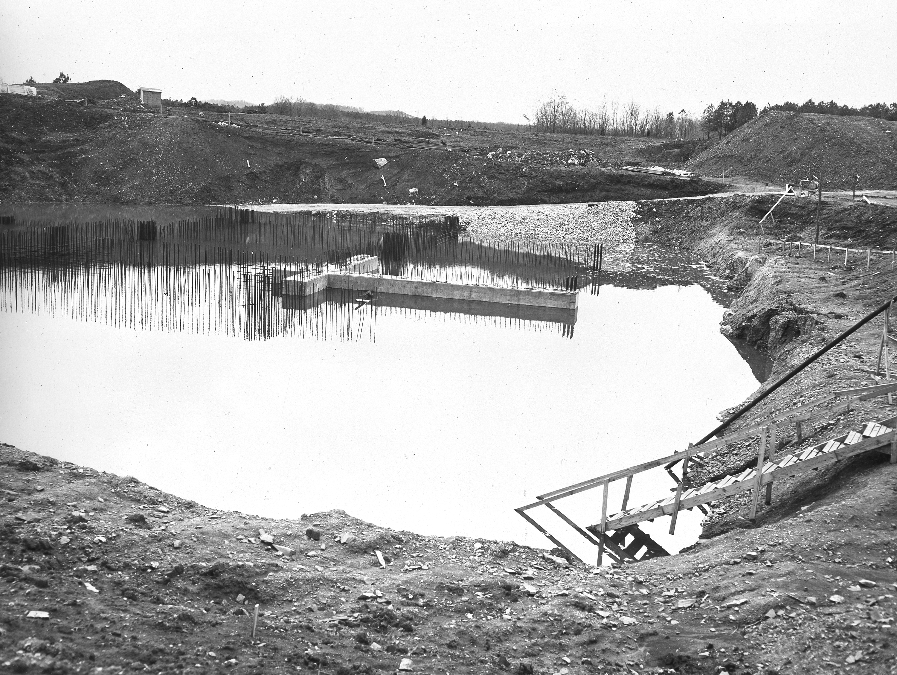 At its founding, the Marshall Space Flight Center (MSFC) inherited the Army’s Jupiter and Redstone test stands, but much larger facilities were needed for the giant stages of the Saturn V. From 1960 to 1964, the existing stands were remodeled and a sizable new test area was developed. The new comprehensive test complex for propulsion and structural dynamics was unique within the nation and the free world, and they remain so today because they were constructed with foresight to meet the future as well as on going needs. Construction of the S-IC Static test stand complex began in 1961 in the west test area of MSFC, and was completed in 1964. The S-IC static test stand was designed to develop and test the 138-ft long and 33-ft diameter Saturn V S-IC first stage, or booster stage, weighing in at 280,000 pounds. Required to hold down the brute force of a 7,500,000-pound thrust produced by 5 F-1 engines, the S-IC static test stand was designed and constructed with the strength of hundreds of tons of steel and 12,000,000 pounds of cement, planted down to bedrock 40 feet below ground level. The foundation walls, constructed with concrete and steel, are 4 feet thick. The base structure consists of four towers with 40-foot-thick walls extending upward 144 feet above ground level. The structure was topped by a crane with a 135-foot boom. With the boom in the upright position, the stand was given an overall height of 405 feet, placing it among the highest structures in Alabama at the time. Construction of the S-IC test stand came to a halt at the end of September as the determination was made that the Saturn booster size had to be increased. As a result, the stand had to be modified. With construction delayed, and pumps turned off, this photo, taken December 8, 1961, shows the abandoned site with floods at the 16 ft mark. The flooding was caused by the disturbance of a natural spring months prior during the excavation of the site.