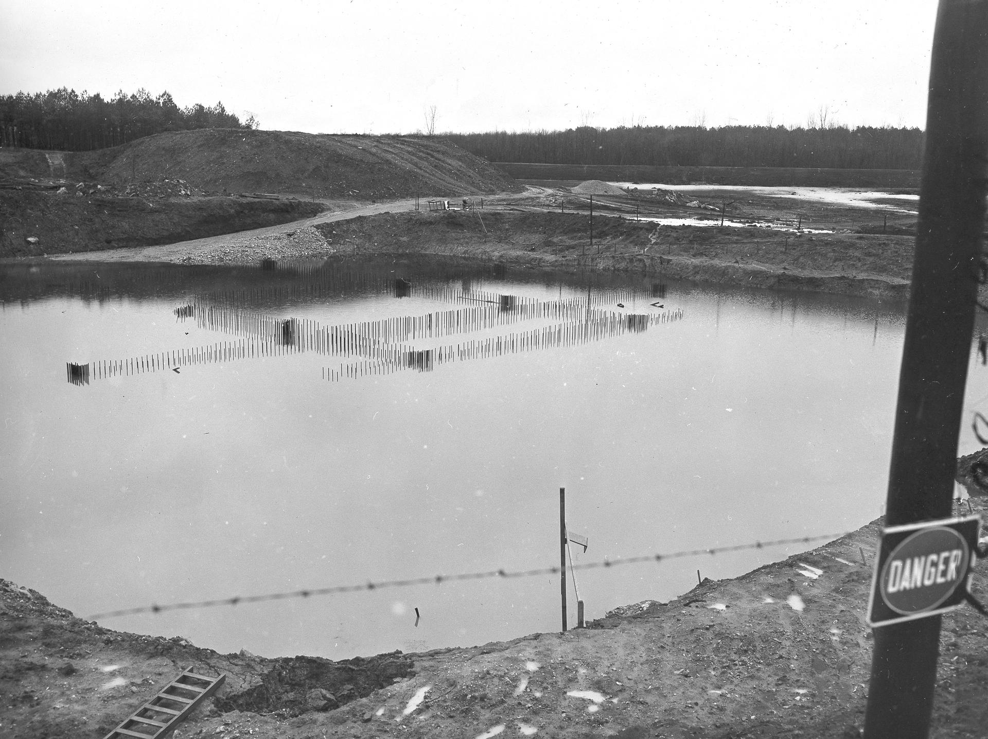 At its founding, the Marshall Space Flight Center (MSFC) inherited the Army’s Jupiter and Redstone test stands, but much larger facilities were needed for the giant stages of the Saturn V. From 1960 to 1964, the existing stands were remodeled and a sizable new test area was developed. The new comprehensive test complex for propulsion and structural dynamics was unique within the nation and the free world, and they remain so today because they were constructed with foresight to meet the future as well as on going needs. Construction of the S-IC Static test stand complex began in 1961 in the west test area of MSFC, and was completed in 1964. The S-IC static test stand was designed to develop and test the 138-ft long and 33-ft diameter Saturn V S-IC first stage, or booster stage, weighing in at 280,000 pounds. Required to hold down the brute force of a 7,500,000-pound thrust produced by 5 F-1 engines, the S-IC static test stand was designed and constructed with the strength of hundreds of tons of steel and 12,000,000 pounds of cement, planted down to bedrock 40 feet below ground level. The foundation walls, constructed with concrete and steel, are 4 feet thick. The base structure consists of four towers with 40-foot-thick walls extending upward 144 feet above ground level. The structure was topped by a crane with a 135-foot boom. With the boom in the upright position, the stand was given an overall height of 405 feet, placing it among the highest structures in Alabama at the time. Construction of the S-IC test stand came to a halt at the end of September as the determination was made that the Saturn booster size had to be increased. As a result, the stand had to be modified. With construction delayed, and pumps turned off, this photo, taken December 11, 1961, shows the abandoned site with floods above the 18 ft mark. The flooding was caused by the disturbance of a natural spring months prior during the excavation of the site.