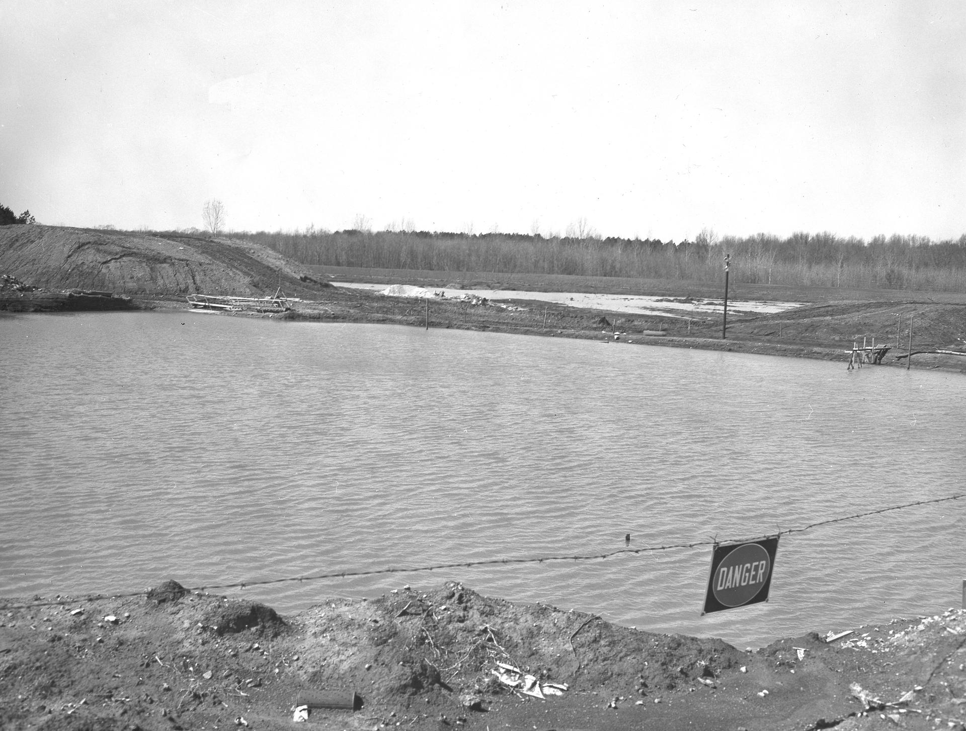 At its founding, the Marshall Space Flight Center (MSFC) inherited the Army’s Jupiter and Redstone test stands, but much larger facilities were needed for the giant stages of the Saturn V. From 1960 to 1964, the existing stands were remodeled and a sizable new test area was developed. The new comprehensive test complex for propulsion and structural dynamics was unique within the nation and the free world, and they remain so today because they were constructed with foresight to meet the future as well as on going needs. Construction of the S-IC Static test stand complex began in 1961 in the west test area of MSFC, and was completed in 1964. The S-IC static test stand was designed to develop and test the 138-ft long and 33-ft diameter Saturn V S-IC first stage, or booster stage, weighing in at 280,000 pounds. Required to hold down the brute force of a 7,500,000-pound thrust produced by 5 F-1 engines, the S-IC static test stand was designed and constructed with the strength of hundreds of tons of steel and 12,000,000 pounds of cement, planted down to bedrock 40 feet below ground level. The foundation walls, constructed with concrete and steel, are 4 feet thick. The base structure consists of four towers with 40-foot-thick walls extending upward 144 feet above ground level. The structure was topped by a crane with a 135-foot boom. With the boom in the upright position, the stand was given an overall height of 405 feet, placing it among the highest structures in Alabama at the time. Construction of the S-IC test stand came to a halt at the end of September as the determination was made that the Saturn booster size had to be increased. As a result, the stand had to be modified. With construction delayed, and pumps turned off, this photo, taken March 15, 1962, shows danger signs posted around the abandoned, flooded site. The flooding was caused by the disturbance of a natural spring months prior during the excavation of the site.