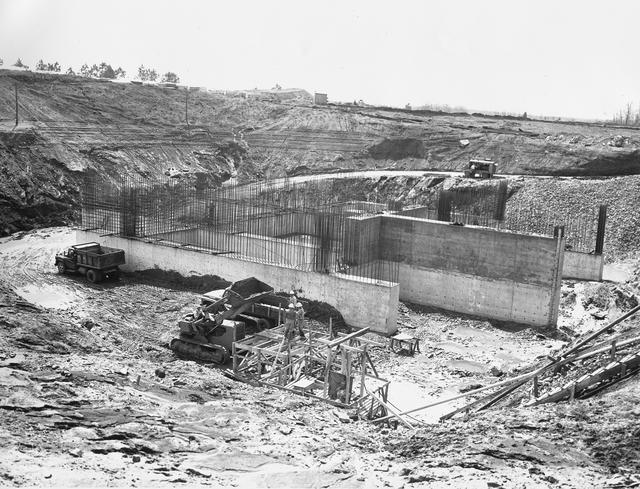 At its founding, the Marshall Space Flight Center (MSFC) inherited the Army’s Jupiter and Redstone test stands, but much larger facilities were needed for the giant stages of the Saturn V. From 1960 to 1964, the existing stands were remodeled and a sizable new test area was developed. The new comprehensive test complex for propulsion and structural dynamics was unique within the nation and the free world, and they remain so today because they were constructed with foresight to meet the future as well as on going needs. Construction of the S-IC Static test stand complex began in 1961 in the west test area of MSFC, and was completed in 1964. The S-IC static test stand was designed to develop and test the 138-ft long and 33-ft diameter Saturn V S-IC first stage, or booster stage, weighing in at 280,000 pounds. Required to hold down the brute force of a 7,500,000-pound thrust produced by 5 F-1 engines, the S-IC static test stand was designed and constructed with the strength of hundreds of tons of steel and 12,000,000 pounds of cement, planted down to bedrock 40 feet below ground level. The foundation walls, constructed with concrete and steel, are 4 feet thick. The base structure consists of four towers with 40-foot-thick walls extending upward 144 feet above ground level. The structure was topped by a crane with a 135-foot boom. With the boom in the upright position, the stand was given an overall height of 405 feet, placing it among the highest structures in Alabama at the time. This photo, taken April 4, 1961, shows the S-IC test stand dry once again when workers resumed construction after a 6 month delay due to booster size reconfiguration back in September of 1961. The disturbance of a natural spring during the excavation of the site required water to be pumped from the site continuously. The site was completely flooded after the pumps were shut down during the construction delay.