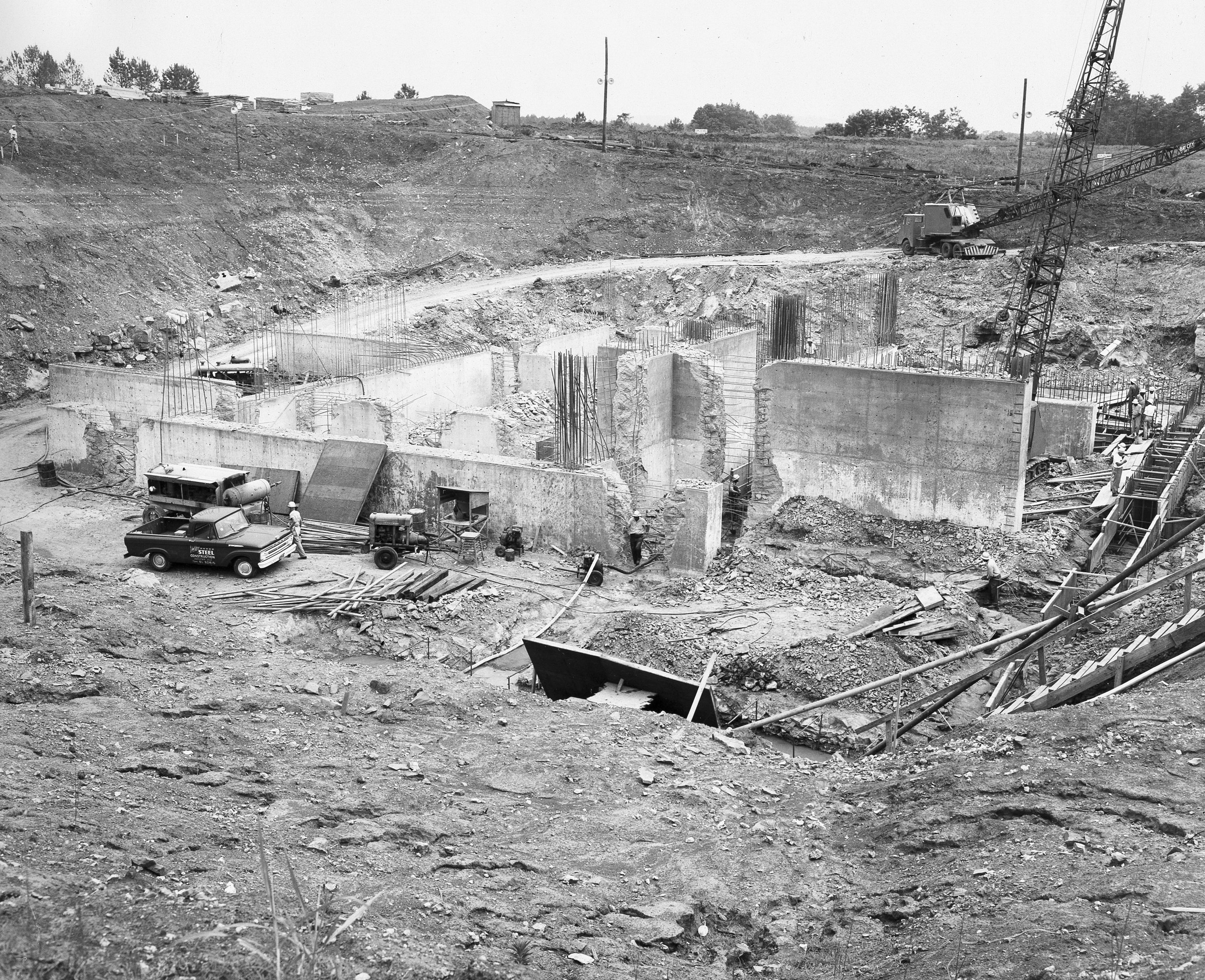 At its founding, the Marshall Space Flight Center (MSFC) inherited the Army’s Jupiter and Redstone test stands, but much larger facilities were needed for the giant stages of the Saturn V. From 1960 to 1964, the existing stands were remodeled and a sizable new test area was developed. The new comprehensive test complex for propulsion and structural dynamics was unique within the nation and the free world, and they remain so today because they were constructed with foresight to meet the future as well as on going needs. Construction of the S-IC Static test stand complex began in 1961 in the west test area of MSFC, and was completed in 1964. The S-IC static test stand was designed to develop and test the 138-ft long and 33-ft diameter Saturn V S-IC first stage, or booster stage, weighing in at 280,000 pounds. Required to hold down the brute force of a 7,500,000-pound thrust produced by 5 F-1 engines, the S-IC static test stand was designed and constructed with the strength of hundreds of tons of steel and 12,000,000 pounds of cement, planted down to bedrock 40 feet below ground level. The foundation walls, constructed with concrete and steel, are 4 feet thick. The base structure consists of four towers with 40-foot-thick walls extending upward 144 feet above ground level. The structure was topped by a crane with a 135-foot boom. With the boom in the upright position, the stand was given an overall height of 405 feet, placing it among the highest structures in Alabama at the time. After a 6 month delay in construction due to size reconfiguration of the Saturn booster, the site was revisited for modifications. The original foundation walls built in the prior year had to be torn down and re-poured to accommodate the larger booster. The demolition can be seen in this photograph taken on May 21, 1962.