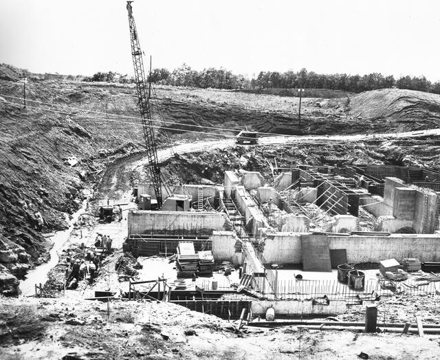 At its founding, the Marshall Space Flight Center (MSFC) inherited the Army’s Jupiter and Redstone test stands, but much larger facilities were needed for the giant stages of the Saturn V. From 1960 to 1964, the existing stands were remodeled and a sizable new test area was developed. The new comprehensive test complex for propulsion and structural dynamics was unique within the nation and the free world, and they remain so today because they were constructed with foresight to meet the future as well as on going needs. Construction of the S-IC Static test stand complex began in 1961 in the west test area of MSFC, and was completed in 1964. The S-IC static test stand was designed to develop and test the 138-ft long and 33-ft diameter Saturn V S-IC first stage, or booster stage, weighing in at 280,000 pounds. Required to hold down the brute force of a 7,500,000-pound thrust produced by 5 F-1 engines, the S-IC static test stand was designed and constructed with the strength of hundreds of tons of steel and 12,000,000 pounds of cement, planted down to bedrock 40 feet below ground level. The foundation walls, constructed with concrete and steel, are 4 feet thick. The base structure consists of four towers with 40-foot-thick walls extending upward 144 feet above ground level. The structure was topped by a crane with a 135-foot boom. With the boom in the upright position, the stand was given an overall height of 405 feet, placing it among the highest structures in Alabama at the time. After a six month delay in construction due to size reconfiguration of the Saturn booster, the site was revisited for modifications in March 1962. The original foundation walls built in the prior year were torn down and re-poured to accommodate the larger boosters. This photo depicts that modification progress as of June 13,1962.