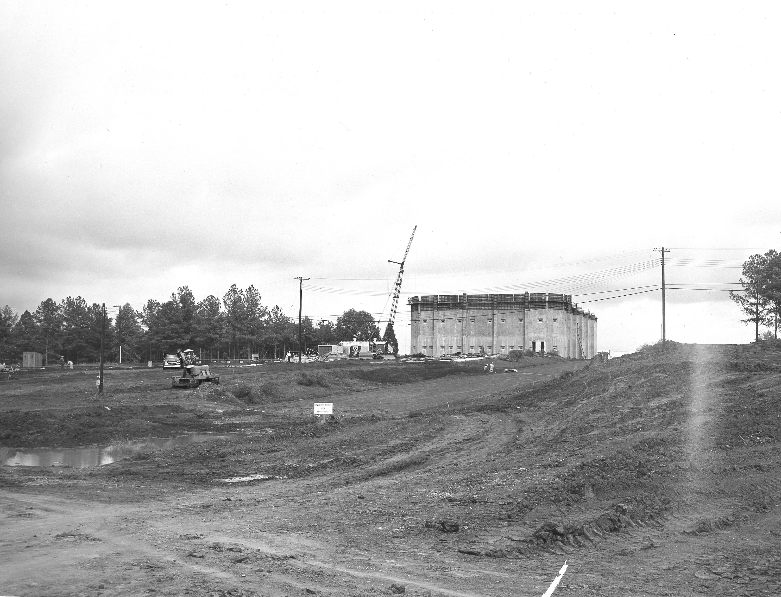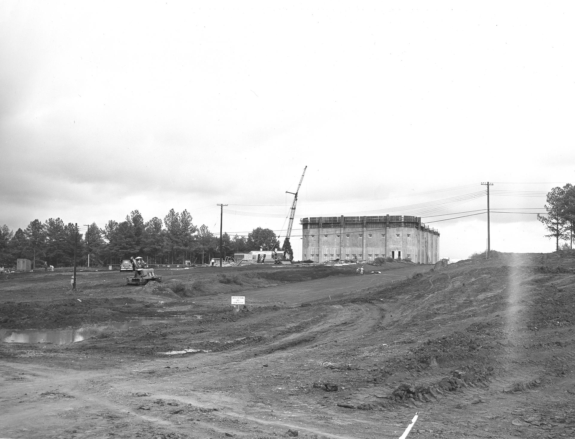 At its founding, the Marshall Space Flight Center (MSFC) inherited the Army’s Jupiter and Redstone test stands, but much larger facilities were needed for the giant stages of the Saturn V. From 1960 to 1964, the existing stands were remodeled and a sizable new test area was developed. The new comprehensive test complex for propulsion and structural dynamics was unique within the nation and the free world, and they remain so today because they were constructed with foresight to meet the future as well as on going needs. Construction of the S-IC Static test stand complex began in 1961 in the west test area of MSFC, and was completed in 1964. The S-IC static test stand was designed to develop and test the 138-ft long and 33-ft diameter Saturn V S-IC first stage, or booster stage, weighing in at 280,000 pounds. Required to hold down the brute force of a 7,500,000-pound thrust produced by 5 F-1 engines, the S-IC static test stand was designed and constructed with the strength of hundreds of tons of steel and 12,000,000 pounds of cement, planted down to bedrock 40 feet below ground level. The foundation walls, constructed with concrete and steel, are 4 feet thick. The base structure consists of four towers with 40-foot-thick walls extending upward 144 feet above ground level. The structure was topped by a crane with a 135-foot boom. With the boom in the upright position, the stand was given an overall height of 405 feet, placing it among the highest structures in Alabama at the time. Built directly east of the test stand was the Block House, which served as the control center for the test stand. The two were connected by a narrow access tunnel which housed the cables for the controls. This construction photo, taken October 8, 1962, depicts a front view of the Block House nearing completion.