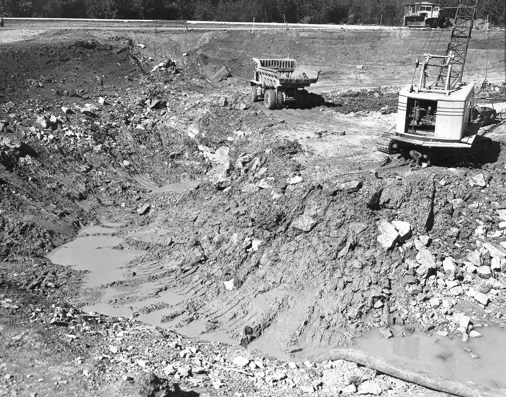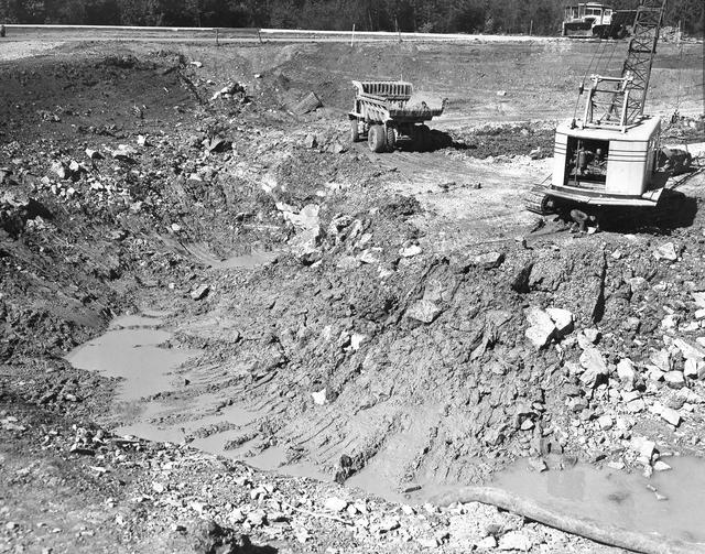 At its founding, the Marshall Space Flight Center (MSFC) inherited the Army’s Jupiter and Redstone test stands, but much larger facilities were needed for the giant stages of the Saturn V. From 1960 to 1964, the existing stands were remodeled and a sizable new test area was developed. The new comprehensive test complex for propulsion and structural dynamics was unique within the nation and the free world, and they remain so today because they were constructed with foresight to meet the future as well as on going needs. Construction of the S-IC Static test stand complex began in 1961 in the west test area of MSFC, and was completed in 1964. The S-IC static test stand was designed to develop and test the 138-ft long and 33-ft diameter Saturn V S-IC first stage, or booster stage, weighing in at 280,000 pounds. Required to hold down the brute force of a 7,500,000-pound thrust produced by 5 F-1 engines, the S-IC static test stand was designed and constructed with the strength of hundreds of tons of steel and 12,000,000 pounds of cement, planted down to bedrock 40 feet below ground level. The foundation walls, constructed with concrete and steel, are 4 feet thick. The base structure consists of four towers with 40-foot-thick walls extending upward 144 feet above ground level. The structure was topped by a crane with a 135-foot boom. With the boom in the upright position, the stand was given an overall height of 405 feet, placing it among the highest structures in Alabama at the time. In addition to the S-IC test stand, related facilities were built during this time. Built to the north of the massive S-IC test stand, was the F-1 Engine test stand. The F-1 test stand, a vertical engine firing test stand, 239 feet in elevation and 4,600 square feet in area at the base, was designed to assist in the development of the F-1 Engine. Capability was provided for static firing of 1.5 million pounds of thrust using liquid oxygen and kerosene. Like the S-IC stand, the foundation of the F-1 stand is keyed into the bedrock approximately 40 feet below grade. This photo, taken October 26, 1962, depicts the excavation process of the single engine F-1 stand.