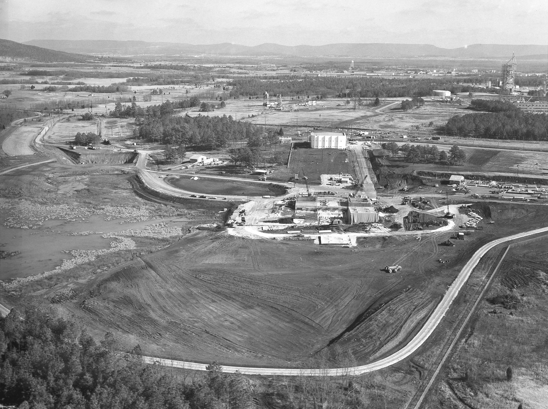 At its founding, the Marshall Space Flight Center (MSFC) inherited the Army’s Jupiter and Redstone test stands, but much larger facilities were needed for the giant stages of the Saturn V. From 1960 to 1964, the existing stands were remodeled and a sizable new test area was developed. The new comprehensive test complex for propulsion and structural dynamics was unique within the nation and the free world, and they remain so today because they were constructed with foresight to meet the future as well as on going needs. Construction of the S-IC Static test stand complex began in 1961 in the west test area of MSFC, and was completed in 1964. The S-IC static test stand was designed to develop and test the 138-ft long and 33-ft diameter Saturn V S-IC first stage, or booster stage, weighing in at 280,000 pounds. Required to hold down the brute force of a 7,500,000-pound thrust produced by 5 F-1 engines, the S-IC static test stand was designed and constructed with the strength of hundreds of tons of steel and 12,000,000 pounds of cement, planted down to bedrock 40 feet below ground level. The foundation walls, constructed with concrete and steel, are 4 feet thick. The base structure consists of four towers with 40-foot-thick walls extending upward 144 feet above ground level. The structure was topped by a crane with a 135-foot boom. With the boom in the upright position, the stand was given an overall height of 405 feet, placing it among the highest structures in Alabama at the time. In addition to the stand itself, related facilities were constructed during this time. Built directly east of the test stand was the Block House, which served as the control center for the test stand. The two were connected by a narrow access tunnel which housed the cables for the controls. The F-1 Engine test stand was built north of the massive S-IC test stand. The F-1 test stand is a vertical engine firing test stand, 239 feet in elevation and 4,600 square feet in area at the base, and was designed to assist in the development of the F-1 Engine. Capability is provided for static firing of 1.5 million pounds of thrust using liquid oxygen and kerosene. Like the S-IC stand, the foundation of the F-1 stand is keyed into the bedrock approximately 40 feet below grade. This aerial photograph, taken January 15, 1963, gives a close overall view of the newly developed test complex. Depicted in the forefront center is the S-IC test stand with towers prominent, the Block House is seen in the center just above the S-IC test stand, and the large hole to the left, located midway between the two is the F-1 test stand site.