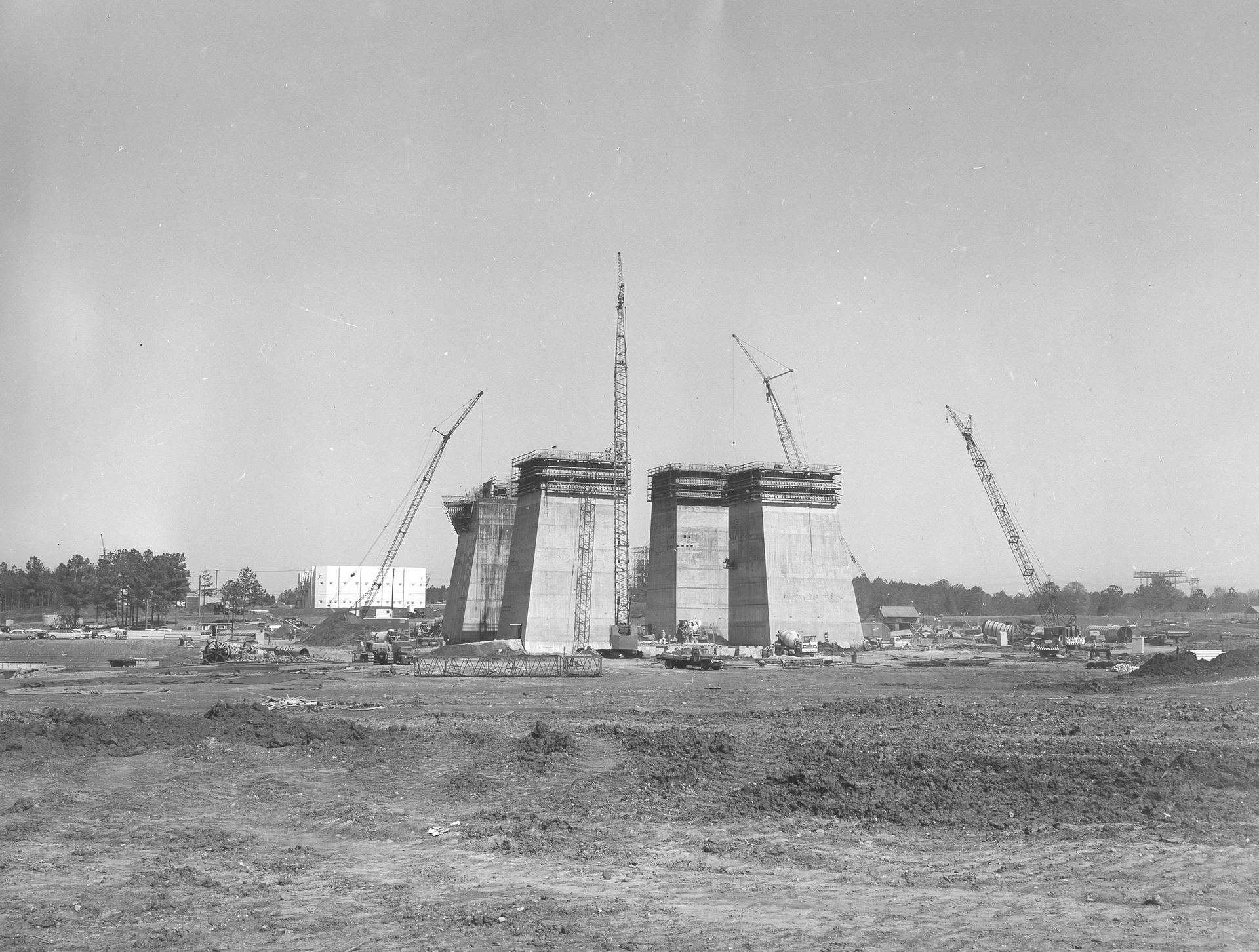 At its founding, the Marshall Space Flight Center (MSFC) inherited the Army’s Jupiter and Redstone test stands, but much larger facilities were needed for the giant stages of the Saturn V. From 1960 to 1964, the existing stands were remodeled and a sizable new test area was developed. The new comprehensive test complex for propulsion and structural dynamics was unique within the nation and the free world, and they remain so today because they were constructed with foresight to meet the future as well as on going needs. Construction of the S-IC Static test stand complex began in 1961 in the west test area of MSFC, and was completed in 1964. The S-IC static test stand was designed to develop and test the 138-ft long and 33-ft diameter Saturn V S-IC first stage, or booster stage, weighing in at 280,000 pounds. Required to hold down the brute force of a 7,500,000-pound thrust produced by 5 F-1 engines, the S-IC static test stand was designed and constructed with the strength of hundreds of tons of steel and 12,000,000 pounds of cement, planted down to bedrock 40 feet below ground level. The foundation walls, constructed with concrete and steel, are 4 feet thick. The base structure consists of four towers with 40-foot-thick walls extending upward 144 feet above ground level. The structure was topped by a crane with a 135-foot boom. With the boom in the upright position, the stand was given an overall height of 405 feet, placing it among the highest structures in Alabama at the time. This photograph, taken April 4, 1963, gives a close up look at the ever-growing four towers of the S-IC Test Stand.