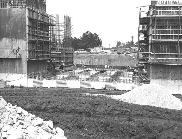 At its founding, the Marshall Space Flight Center (MSFC) inherited the Army’s Jupiter and Redstone test stands, but much larger facilities were needed for the giant stages of the Saturn V. From 1960 to 1964, the existing stands were remodeled and a sizable new test area was developed. The new comprehensive test complex for propulsion and structural dynamics was unique within the nation and the free world, and they remain so today because they were constructed with foresight to meet the future as well as on going needs. Construction of the S-IC Static test stand complex began in 1961 in the west test area of MSFC, and was completed in 1964. The S-IC static test stand was designed to develop and test the 138-ft long and 33-ft diameter Saturn V S-IC first stage, or booster stage, weighing in at 280,000 pounds. Required to hold down the brute force of a 7,500,000-pound thrust produced by 5 F-1 engines, the S-IC static test stand was designed and constructed with the strength of hundreds of tons of steel and 12,000,000 pounds of cement, planted down to bedrock 40 feet below ground level. The foundation walls, constructed with concrete and steel, are 4 feet thick. The base structure consists of four towers with 40-foot-thick walls extending upward 144 feet above ground level. The structure was topped by a crane with a 135-foot boom. With the boom in the upright position, the stand was given an overall height of 405 feet, placing it among the highest structures in Alabama at the time. In addition to the stand itself, related facilities were constructed during this time. North of the massive S-IC test stand, the F-1 Engine test stand was built. Designed to assist in the development of the F-1 Engine, the F-1 test stand is a vertical engine firing test stand, 239 feet in elevation and 4,600 square feet in area at the base. Capability was provided for static firing of 1.5 million pounds of thrust using liquid oxygen and kerosene. Like the S-IC stand, the foundation of the F-1 stand is keyed into the bedrock approximately 40 feet below grade. This photo depicts the construction of the F-1 test stand as of July 3, 1963. All four of its tower legs are well underway.