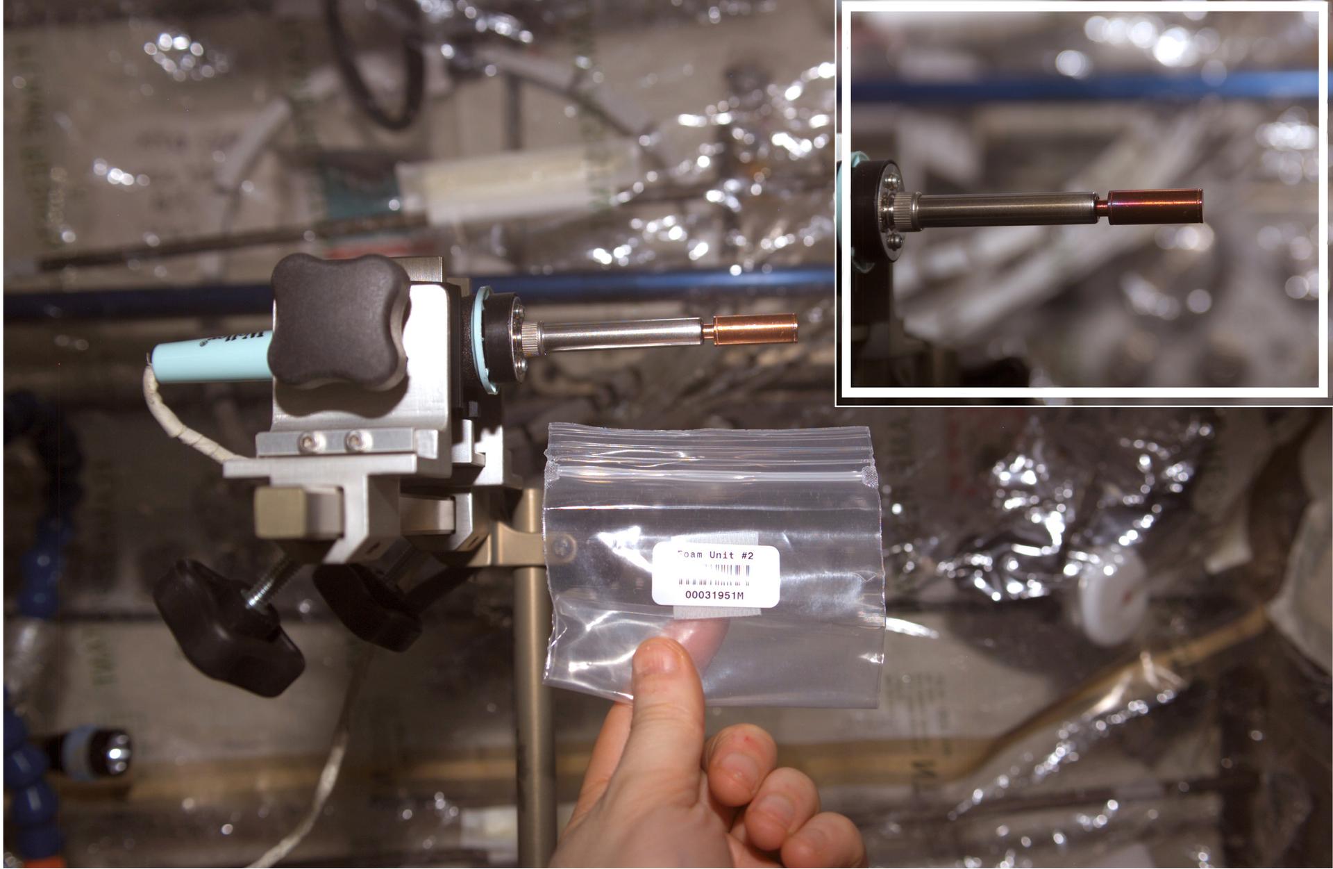 This soldering iron has an evacuated copper capsule at the tip that contains a pellet of Bulk Metallic Glass (BMG) aboard the International Space Station (ISS). Prior to flight, researchers sealed a pellet of bulk metallic glass mixed with microscopic gas-generating particles into the copper ampoule under vacuum. Once heated in space, such as in this photograph, the particles generated gas and the BMG becomes a viscous liquid. The released gas made the sample foam within the capsule where each microscopic particle formed a gas-filled pore within the foam. The inset image shows the oxidation of the sample after several minutes of applying heat. Although hidden within the brass sleeve, the sample retained the foam shape when cooled, because the viscosity increased during cooling until it was solid.