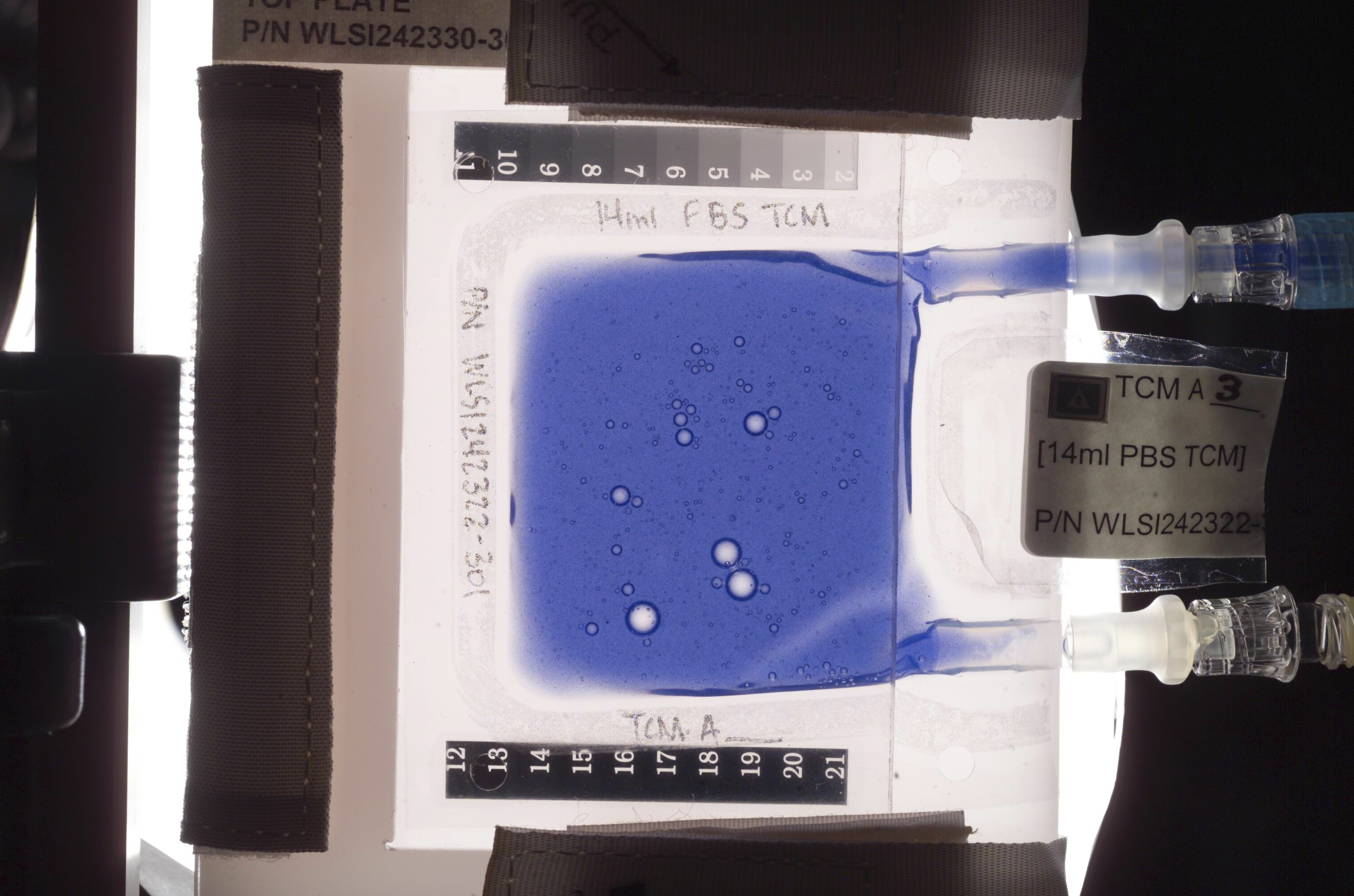 Aboard the International Space Station (ISS), the Tissue Culture Module (TCM) is the stationary bioreactor vessel in which cell cultures grow. However, for the Cellular Biotechnology Operations Support Systems-Fluid Dynamics Investigation (CBOSS-FDI), color polystyrene beads are used to measure the effectiveness of various mixing procedures. The beads are similar in size and density to human lymphoid cells. Uniform mixing is a crucial component of CBOSS experiments involving the immune response of human lymphoid cell suspensions. The goal is to develop procedures that are both convenient for the flight crew and are optimal in providing uniform and reproducible mixing of all components, including cells. The average bead density in a well mixed TCM will be uniform, with no bubbles, and it will be measured using the absorption of light. In this photograph, a TCM is shown after mixing protocols, and bubbles of various sizes can be seen.