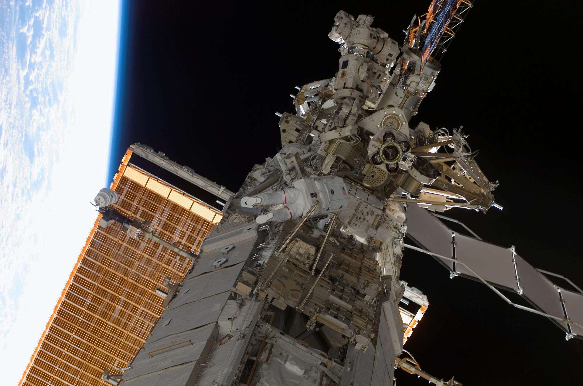 As the construction continued on the International Space Station (ISS), STS-118 Astronaut Rick Mastracchio and Canada Space Agency representative Dave Williams (out of frame), participated in the first session of Extra Vehicular Activity (EVA) for the mission. During the 6 hour, 17 minute space walk, the two attached the Starboard 5 (S5) segment of truss, retracted the forward heat rejecting radiator from the Port 6 (P6) truss, and performed several get ahead tasks.