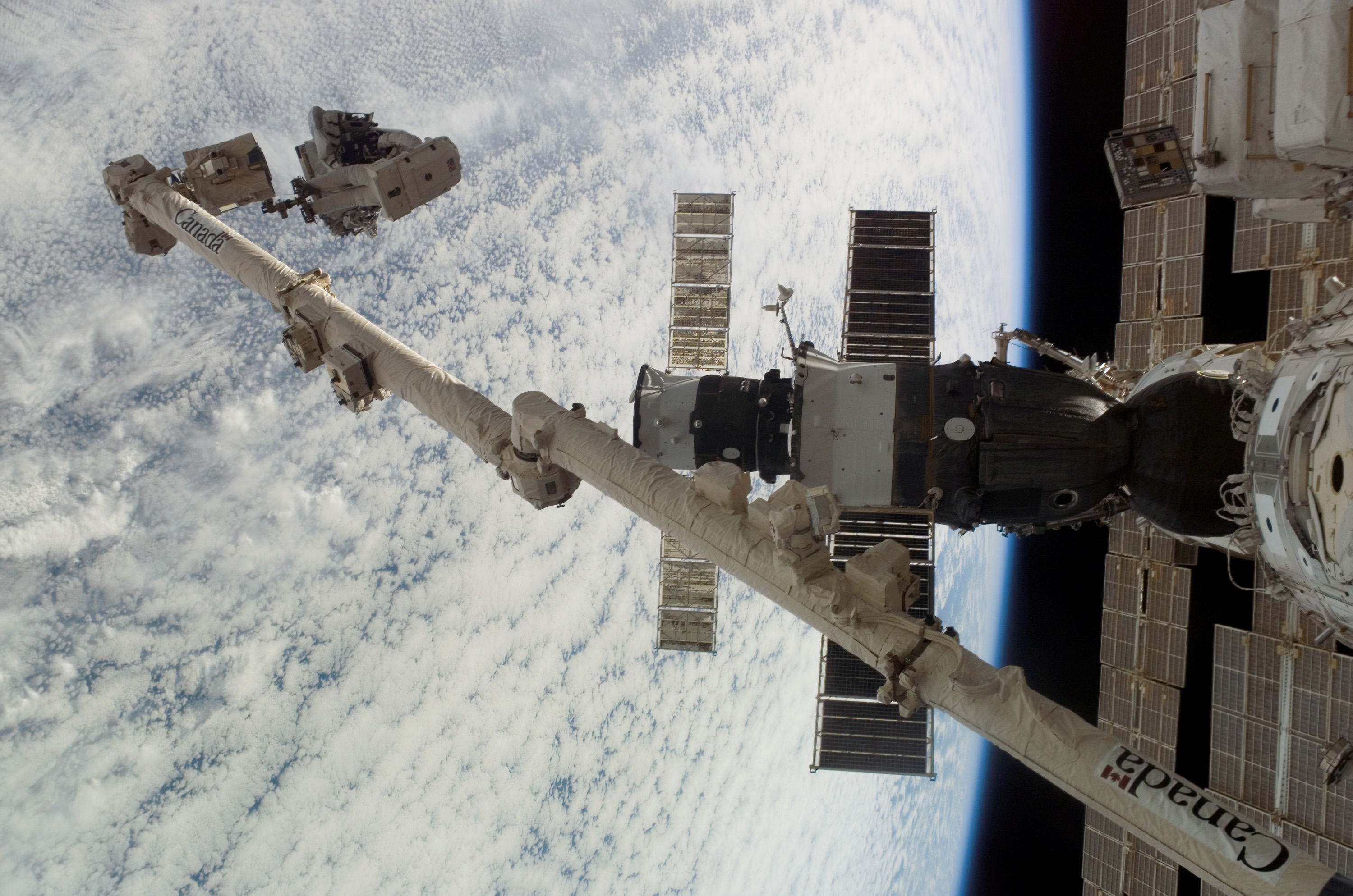 As the construction continued on the International Space Station (ISS), STS-118 astronaut and mission specialist, Dave Williams, representing the Canadian Space Agency, was anchored on the foot restraint of the Canadarm2 as he participated in the second session of Extra Vehicular Activity (EVA) for the mission. Assisting Williams was Rick Mastracchio (out of frame). During the 6 hour, 28 minute space walk, the two removed a faulty control moment gyroscope (CMG-3) and installed a new CMG into the Z1 truss. The failed CMG will remain in its temporary stowage location on the exterior of the station until it is returned to Earth on a later Shuttle mission. The new gyroscope is one of four CMGs that are used to control the orbital attitude of the station.