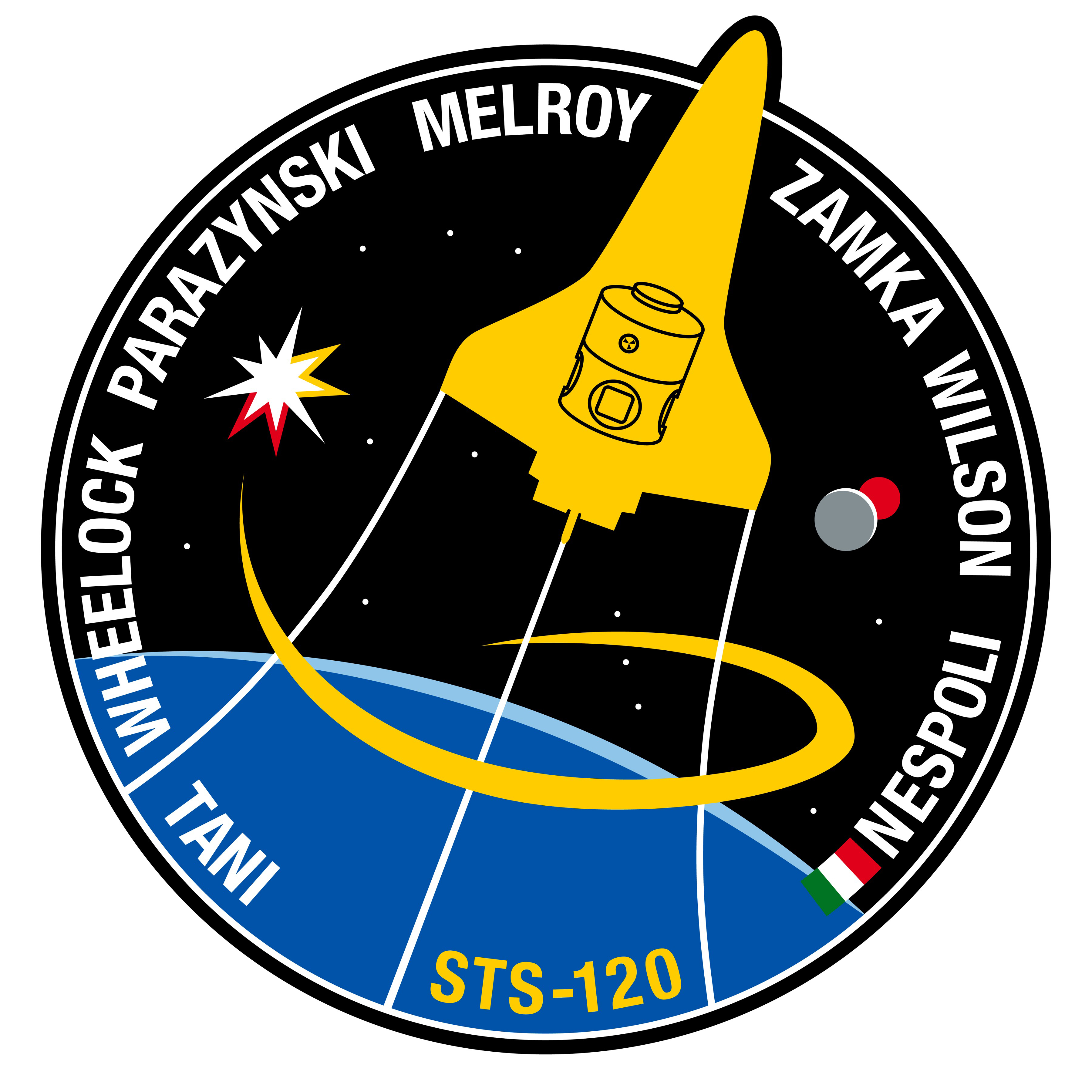 The STS-120 patch reflects the role of the mission in the future of the space program. The shuttle payload bay carries Node 2, Harmony, the doorway to the future international laboratory elements on the International Space Station (ISS). The star on the left represents the ISS; the red colored points represent the current location of the P6 solar array, furled and awaiting relocation when the crew arrives. During the mission, the crew will move P6 to its final home at the end of the port truss. The gold points represent the P6 solar array in its new location, unfurled and producing power for science and life support. On the right, the moon and Mars can be seen representing the future of NASA. The constellation Orion rises in the background, symbolizing NASA's new exploration vehicle. Through all, the shuttle rises up and away, leading the way to the future.
