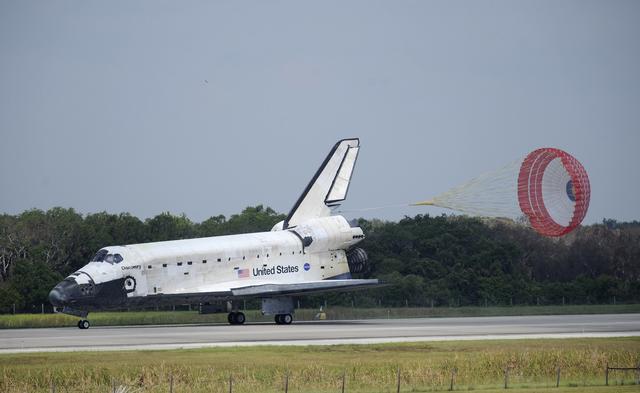 CAPE CANAVERAL, Fla. – In the 69th landing at NASA's Kennedy Space Center, space shuttle Discovery comes to a stop on Runway15 with the aid of a drag chute to end the STS-124 mission, a 14-day flight to the International Space Station. The main landing gear touched down at 11:15:19 a.m. EDT. The nose landing gear touched down at 11:15:30 a.m. and wheel stop was at 11:16:19 a.m. The mission completed 5.7 million miles. The STS-124 mission delivered the Japan Aerospace Exploration Agency's large Japanese Pressurized Module and its remote manipulator system to the space station. Photo credit: NASA/Bill Ingalls