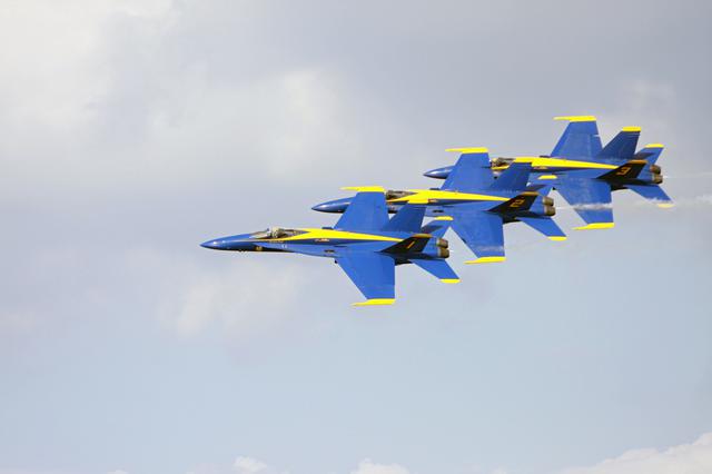 CAPE CANAVERAL, Fla. – The U.S. Navy's Blue Angels perform their tight maneuvers over NASA's Kennedy Space Center in Florida during the Kennedy Space Center Visitor Complex Space and Air Show held Nov. 8-9. This year’s show brought together the best in military aircraft, such as the F_A-18 Super Hornet and F-16 Fighting Falcon, coupled with precision pilots and veteran astronauts to celebrate spaceflight and aviation. The event included a water rescue demonstration by the 920th Rescue Wing. Photo credit: NASA_Troy Cryder