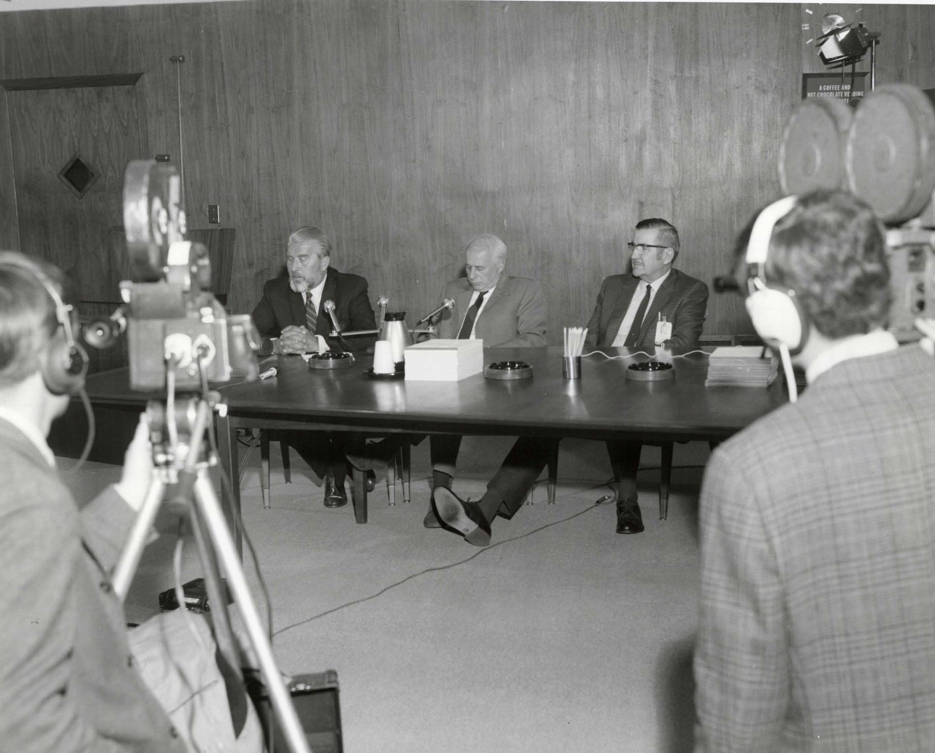 Dr. Wernher Von Braun, Dr. Eberhard Rees, and R.W. Cook at a press conference with cameras in the foreground.