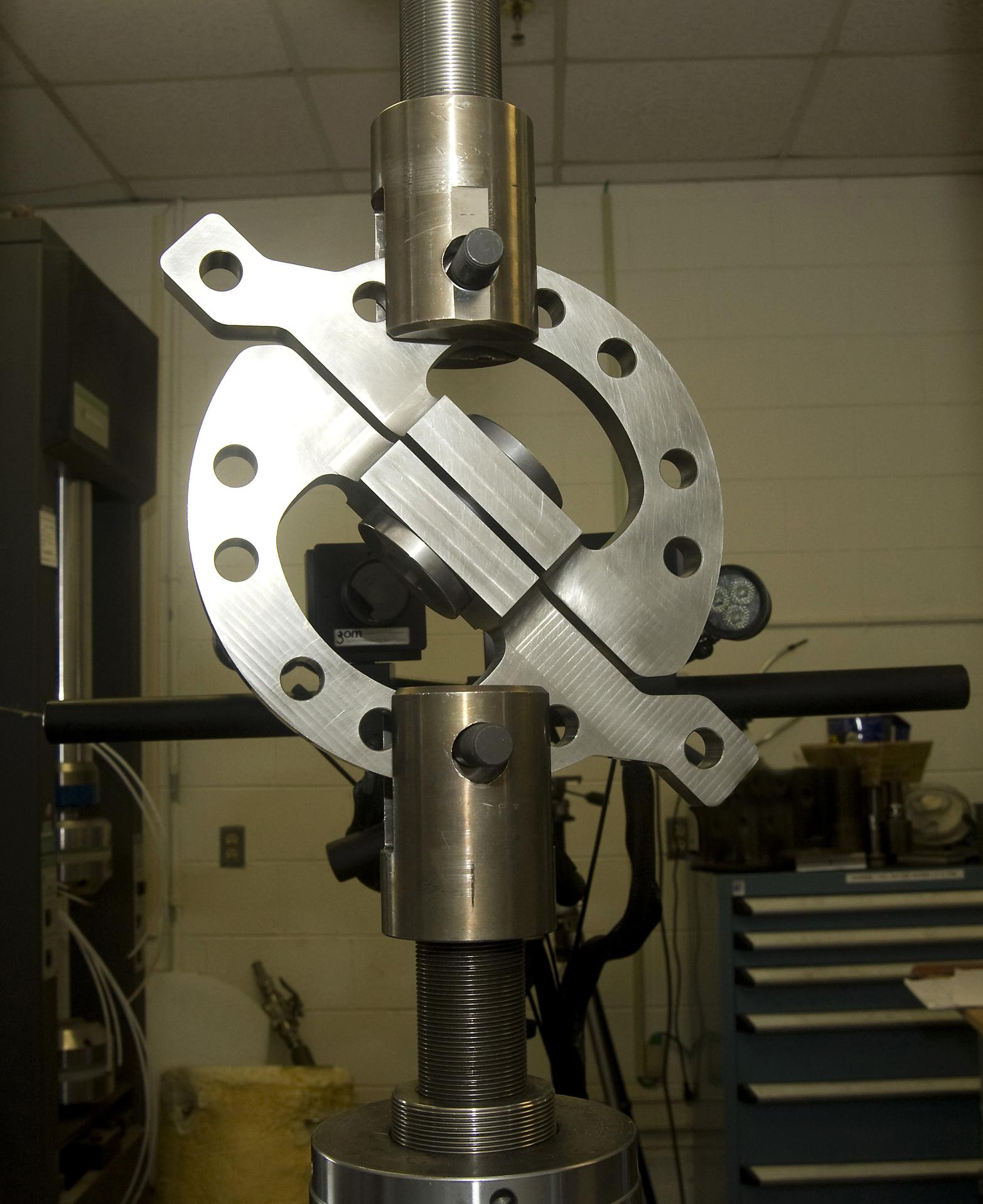 DEVELOPMENT TESTING BEING CONDUCTED AT THE REQUEST OF THE MSFC DYNAMICS, LOADS, AND STRENGTH BRANCH (EV31) TO STUDY THE FAILURE BEHAVIOR OF FASTENERS SUBJECTED TO COMBINED SHEAR AND TENSION LOADING. THE DATA FROM THIS TESTING WILL BE USED TO DEVELOP APPROPRIATE STRUCTURAL ANALYSIS METHODS AS PART OF A FASTENER STANDARDS EFFORT SPONSORED BY THE NASA ENGINEERING SAFETY CENTER (NESC). THE TEST FIXTURE WAS DESIGNED AND FABRICATED THROUGH THE MSFC MECHANICAL FABRICATION BRANCH (ES23). THE TESTING ORGANIZATION IS THE MSFC MATERIALS TEST BRANCH (EM10).