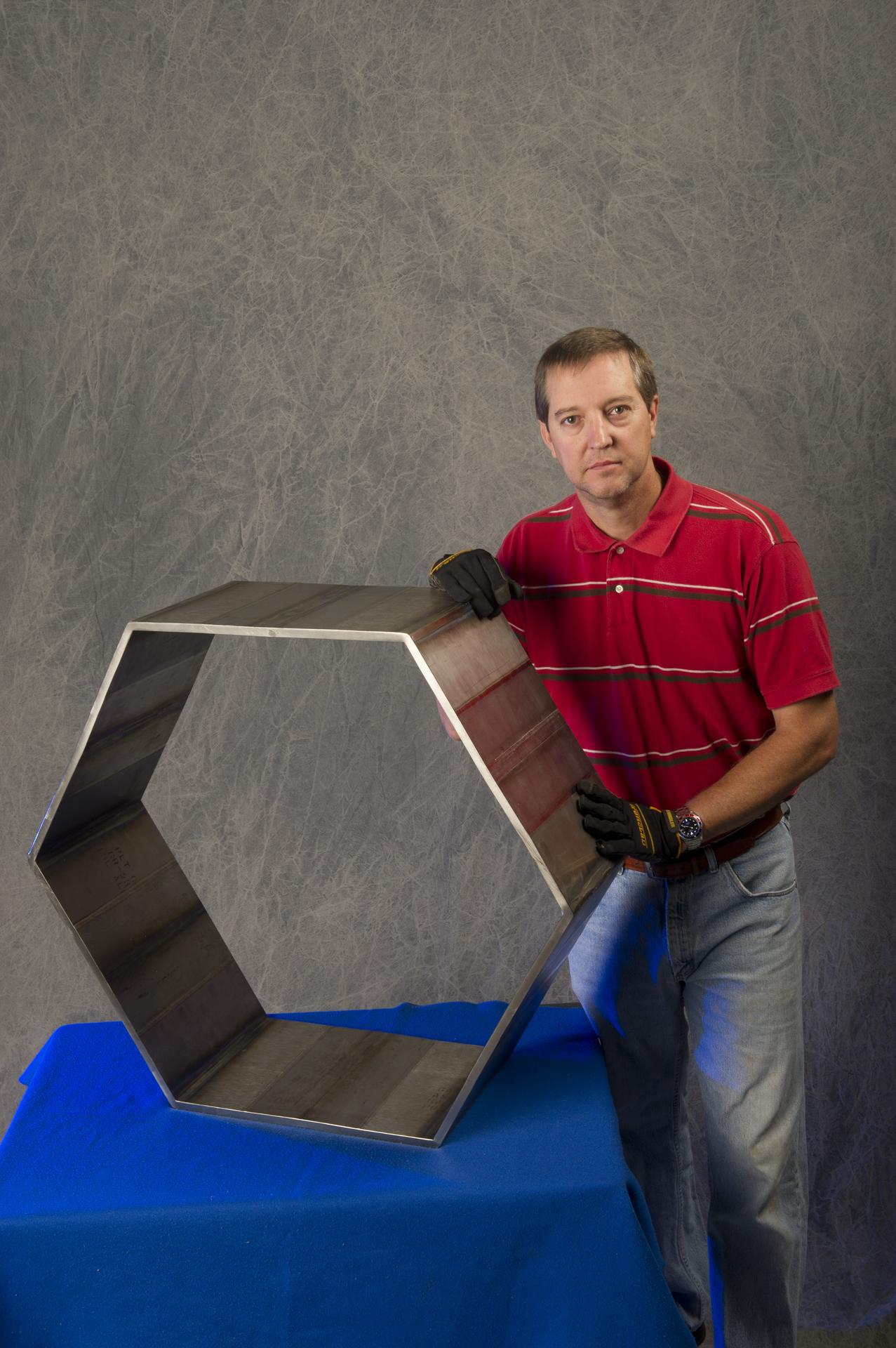 ANDRÉ PASEUR (WELD TECHNICIAN, JACOBS ESTS GROUP/ERC) DISPLAYS A HEXAGON THAT WAS FABRICATED FROM FRICTION STIR WELDED PLATES OF 6AL-4V TITANIUM (ELI) USING THERMAL STIR WELDING. THIS WORK WAS PERFORMED FOR A NASA TECHNOLOGY TRANSFER INDUSTRIAL PARTNER (KEYSTONE SYNERGETIC ENTERPRISES, INC.) IN SUPPORT OF A PROJECT FOR THE U.S. NAVY