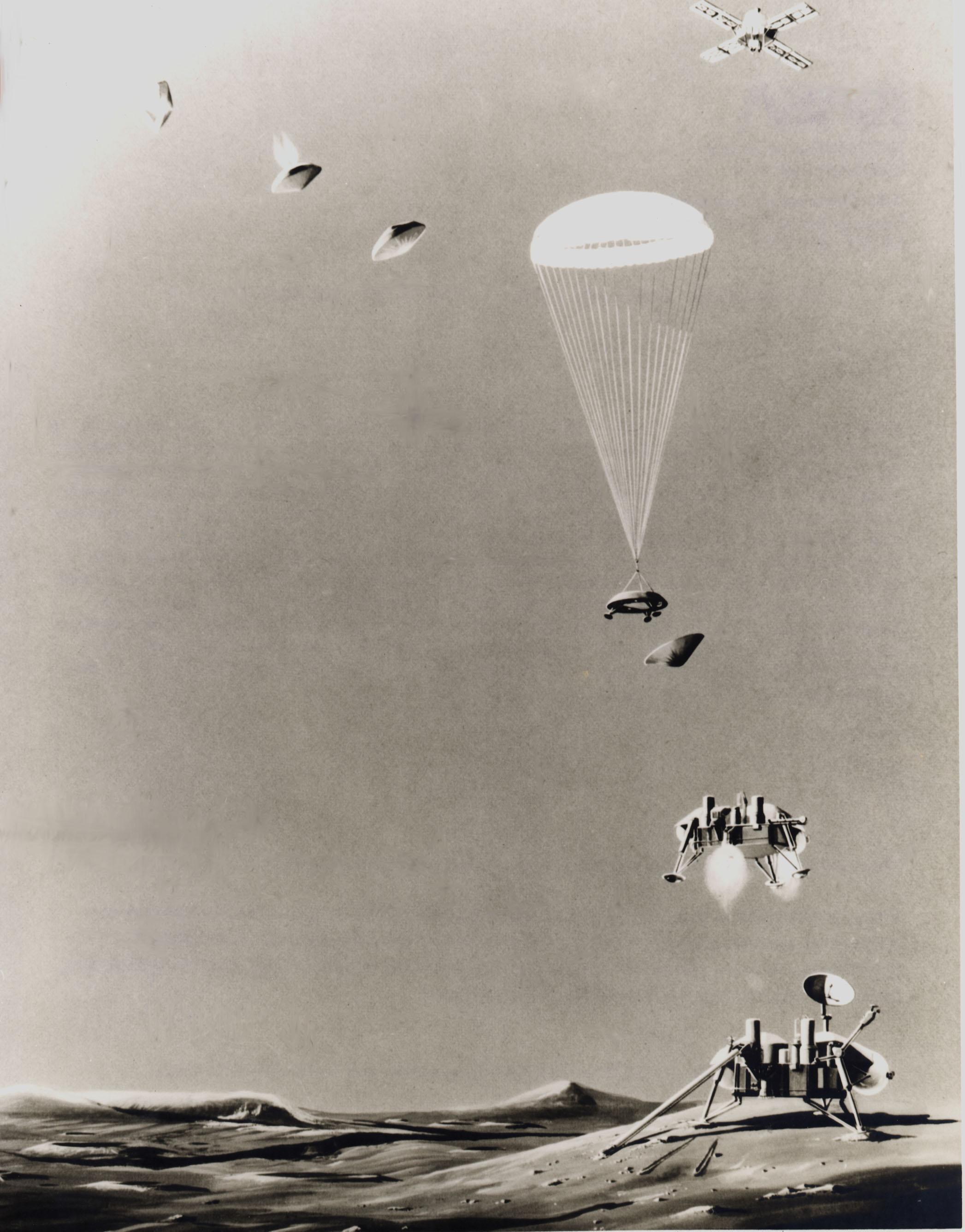 This is an artist's conception of the sequence of events that will take place just prior to landing a life-detection laboratory on the surface of Mars on July 4, 1976. Above right, the Viking spacecraft, composed of an orbiter and a lander, has been in orbit around the Red Planet since June 19, 1976, taking pictures of the planned landing site to ascertain its safety before releasing the lander (top, left) for its threeto five-hour descent. Protected by aeroshells, the heat-sterilized lander hurtles into the thin Martian atmosphere at a speed of about 10,000 mph, to be slowed first by aerodynamic drag until the shell is discarded, then by parachute (center) and finally by retrorockets to assure a gentle landing. Instruments will study the structure and composition of the Martian atmosphere as the lander drifts down. Viking 2 is scheduled to arrive at Mars on Aug. 7 and touch down on the surface on Sept. 4.