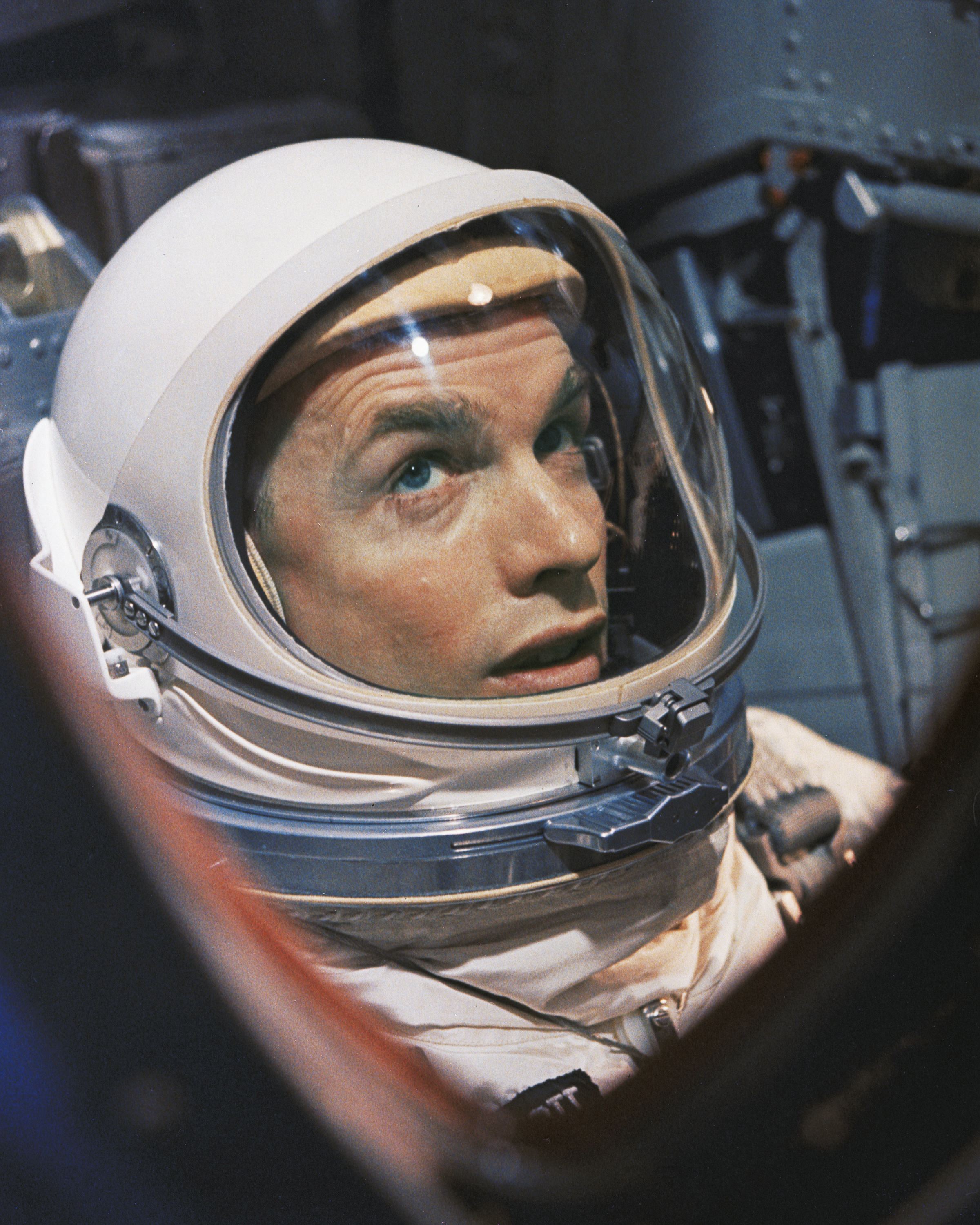 KSC-66C-1871 Gemini 8 Pilot David R. Scott seen through window of Gemini 8 Spacecraft just before liftoff. (jrs)