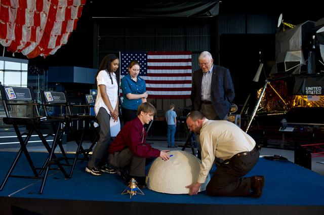STUDENTS FROM THE CENTER FOR TECHNOLOGY SHOW APOLLO 13 ASTRONAUT FRED HAISE A DISPLAY MODEL FOR A MOON BASED PROJECT THEY ARE DESIGNING FOR COMPETITION WITH OTHER SCHOOLS IN ALABAMA. (L to R) QUIANA HUNT, SARAH FOLSE, MICHAEL HARTMAN, MIKE EVANS (TEACHER), AND FRED HAISE