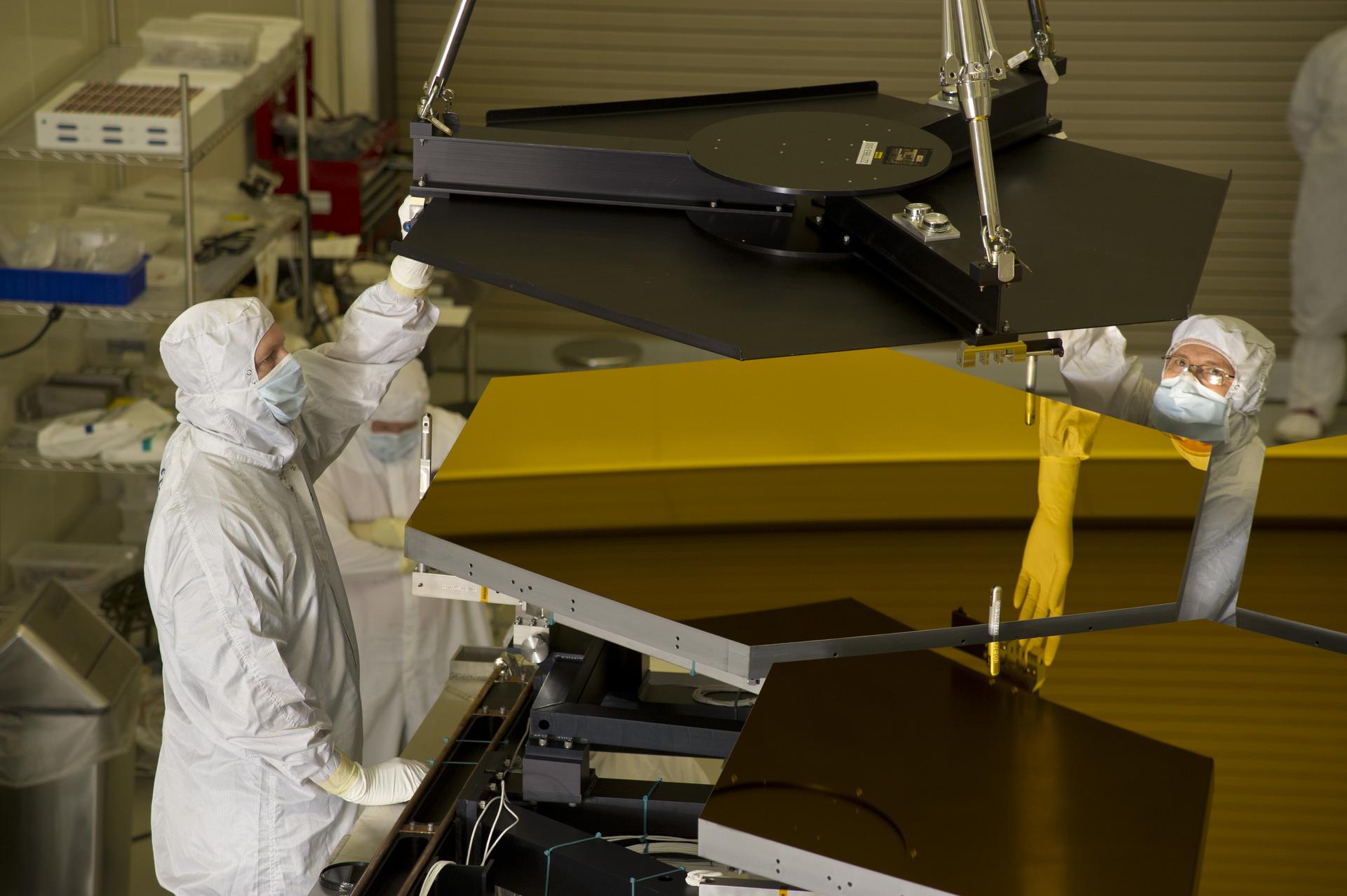 BALL ENGINEERS DISMANTLE ARRAY OF SIX GOLD-PLATED JAMES WEBB SPACE TELESCOPE MIRRORS FOR TRANSPORT TO BALL AEROSPACE AFTER CRYOGENIC TESTING AT MARSHALL'S X-RAY AND CRYOGENIC FACILITY.