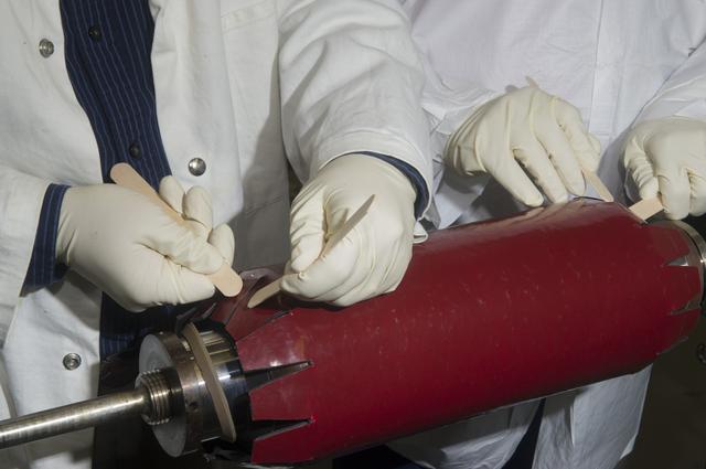 MATERIALS ENGINEER CHAD HASTINGS AND ENGINEERING TECHNICIAN PHILLIP THOMPSON LAYING UP RUBBER INSULATION ON BURST TEST ARTICLE