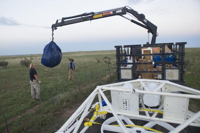 HEROES PAYLOAD AWAITS LAUNCH AS HELIUM BALLOON INFLATES IN BACKGROUND, FORT SUMNER, NEW MEXICO, SEPTEMBER 21, 2013