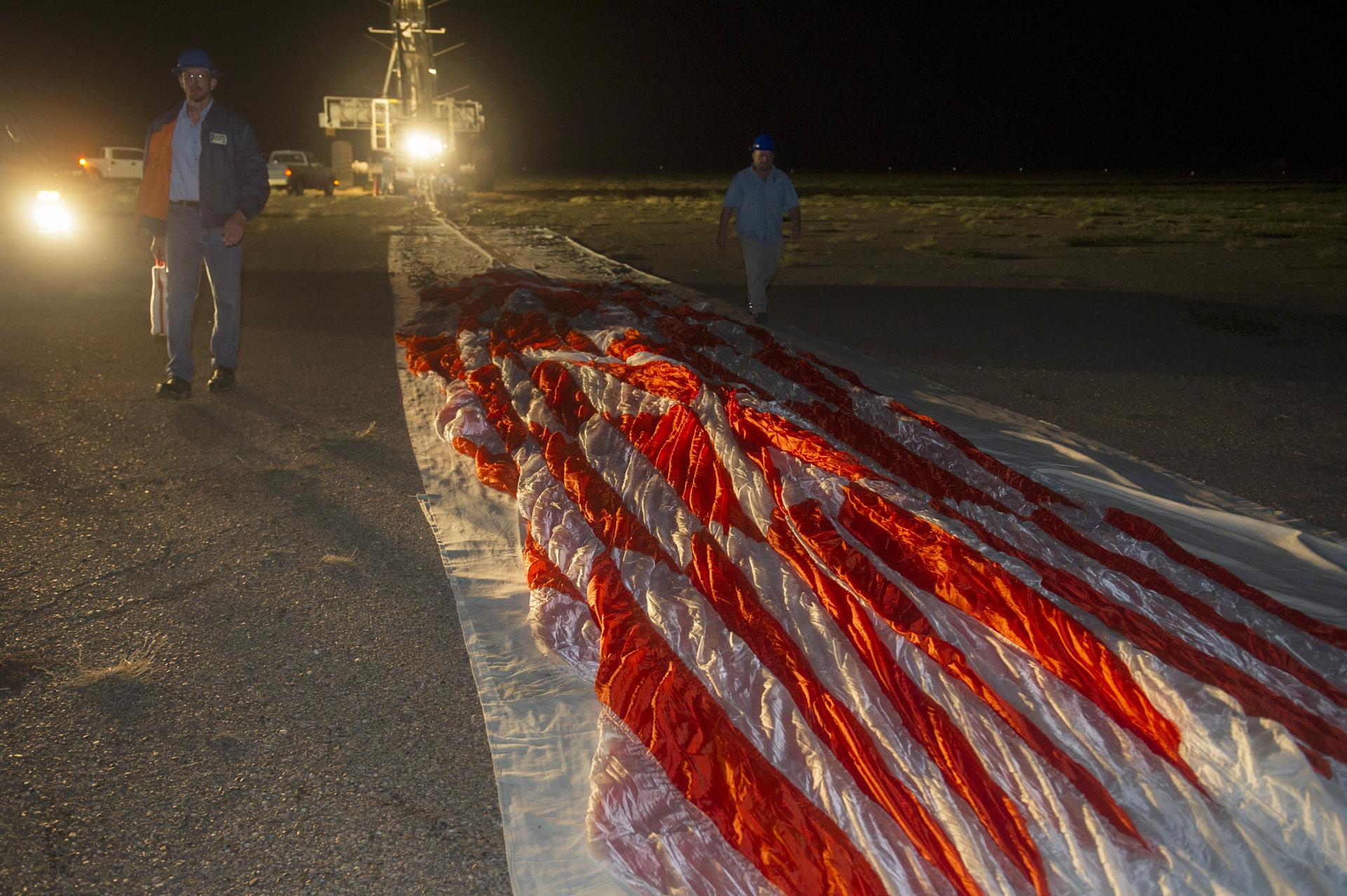HEROES PAYLOAD AWAITS LAUNCH AS HELIUM BALLOON INFLATES IN BACKGROUND, FORT SUMNER, NEW MEXICO, SEPTEMBER 21, 2013