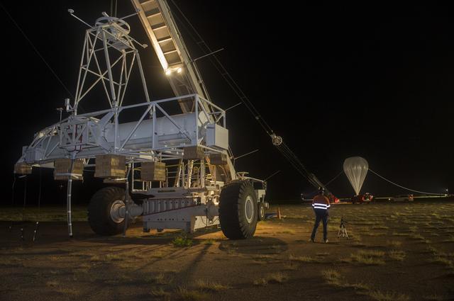 HEROES PAYLOAD AWAITS LAUNCH AS HELIUM BALLOON INFLATES IN BACKGROUND, FORT SUMNER, NEW MEXICO, SEPTEMBER 21, 2013
