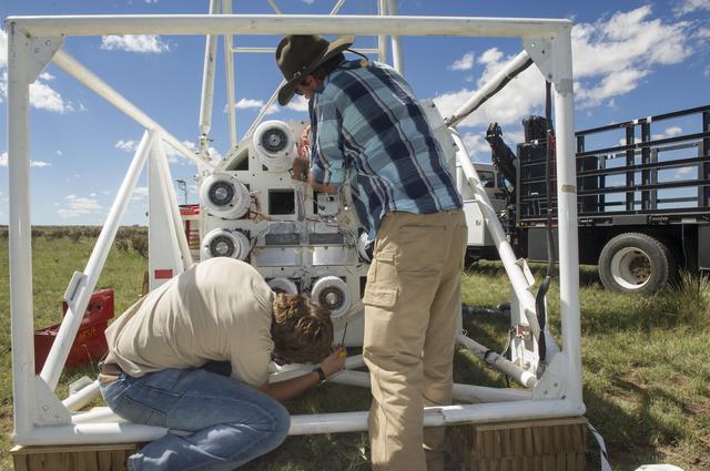 HEROES PAYLOAD AWAITS LAUNCH AS HELIUM BALLOON INFLATES IN BACKGROUND, FORT SUMNER, NEW MEXICO, SEPTEMBER 21, 2013