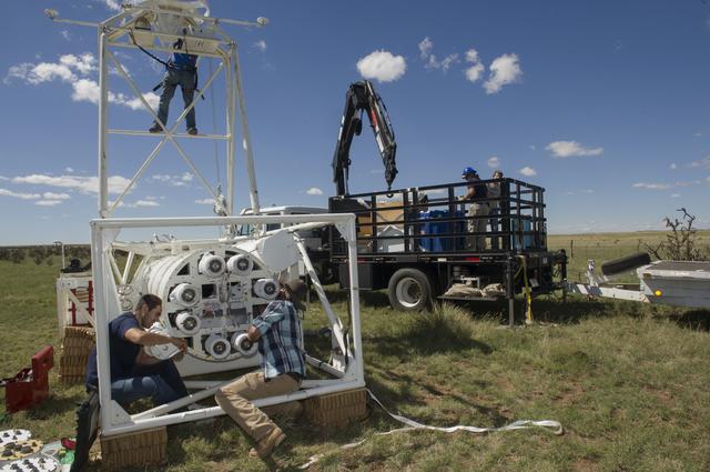 HEROES PAYLOAD AWAITS LAUNCH AS HELIUM BALLOON INFLATES IN BACKGROUND, FORT SUMNER, NEW MEXICO, SEPTEMBER 21, 2013