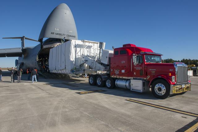 JAMES WEBB SPACE TELESCOPE (JWST) BACKPLANE MOVE FROM MARSHALL SPACE FLIGHT CENTER’S X-RAY CALIBRATION FACILITY (XCRF) TO THE REDSTONE ARSENAL AIRFIELD WHERE THE TEST ARTICLE WAS PLACED IN A USAF C-5 GALAXY FOR IT’S FLIGHT BACK TO THE MANUFACTURER.
