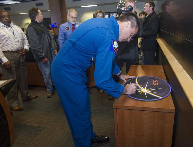 NASA ASTRONAUT CHRIS CASSIDY, ,SIGNS A PLAQUE TO BE MOUNTED IN THE PAYLOAD OPERATIONS INTEGRATION CENTER AT THE MARSHALL SPACE FLIGHT CENTER.