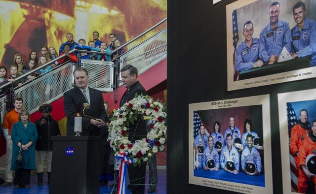ASTRONAUT JIM HALSELL AND MSFC DIRECTOR PATRICK SCHEUERMANN LIGHT MEMORIAL CANDLE AT REMEMBRANCE DAY EVENT AT USSRC