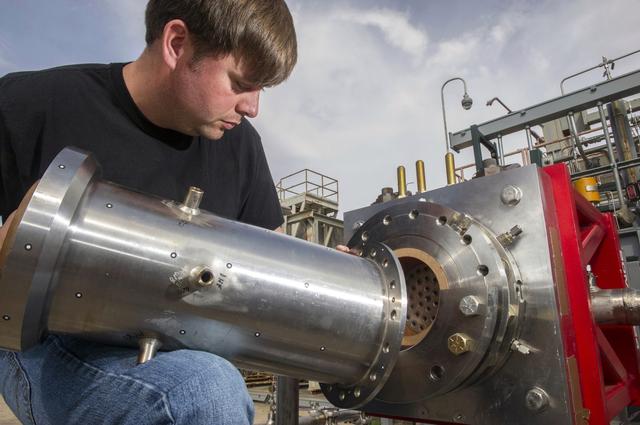 1. ENGINEERS AND TECHNICIANS PREPARE FOR AN UPCOMING HOT-FIRE TEST OF A ROCKET INJECTOR MANUFACTURED USING ADDITIVE MANUFACTURING, OR 3-D PRINTING…RANDALL MCALLISTER, INFOPRO TECHNICIAN, FITS NOZZLE TO ROCKET INJECTOR