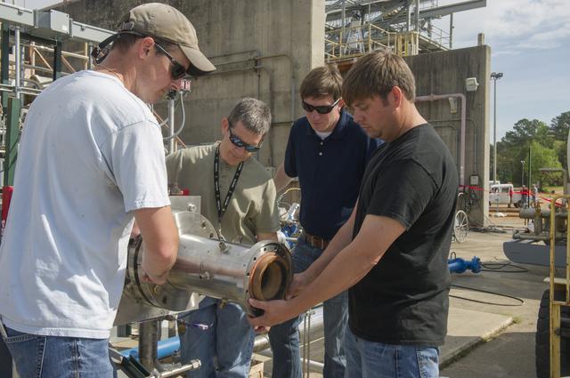 2. ENGINEERS AND TECHNICIANS PREPARE FOR AN UPCOMING HOT-FIRE TEST OF A ROCKET INJECTOR MANUFACTURED USING ADDITIVE MANUFACTURING, OR 3-D PRINTING…(L TO R) WILLIE PARKER, INFOPRO TECHNICIAN, BRAD BULLARD, NASA, NICK CASE, NASA, AND RANDALL MCALLISTER, INFOPRO TECHNICIAN