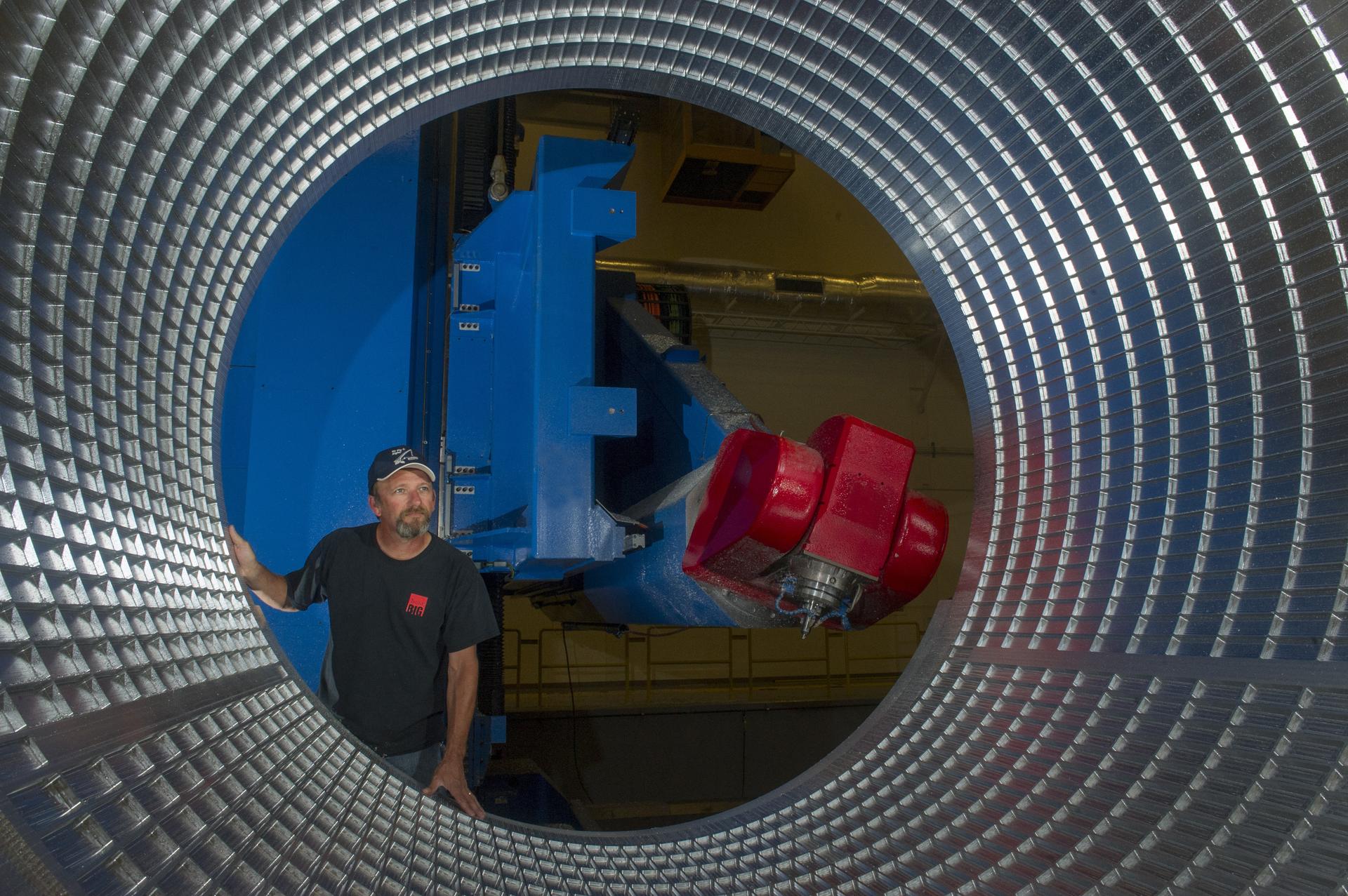 DAVID OSBORNE, A MACHINIST ON THE METTS CONTRACT, INSPECTS THE ORTHOGRID TOOL PATH ON AN 8 FOOT CF1 BARREL IN SUPPORT OF THE SHELL BUCKLING TEST FOR LANGLEY RESEARCH CENTER. THIS IS THE FIRST BARREL THAT MSFC HAS MANUFACTURED FROM EXTRUDED MATERIAL, VERSUS THE ORIGINAL DESIGN BEING 3 SECTIONS BARREL PANELS THAT WERE FRICTION STIR WELDED. THE TESTING WILL SHOW THE DIFFERENT STRENGTH PROPERTIES FROM A WELDED VERSION TO A FULLY EXTRUDED PIECE OF MATERIAL.
