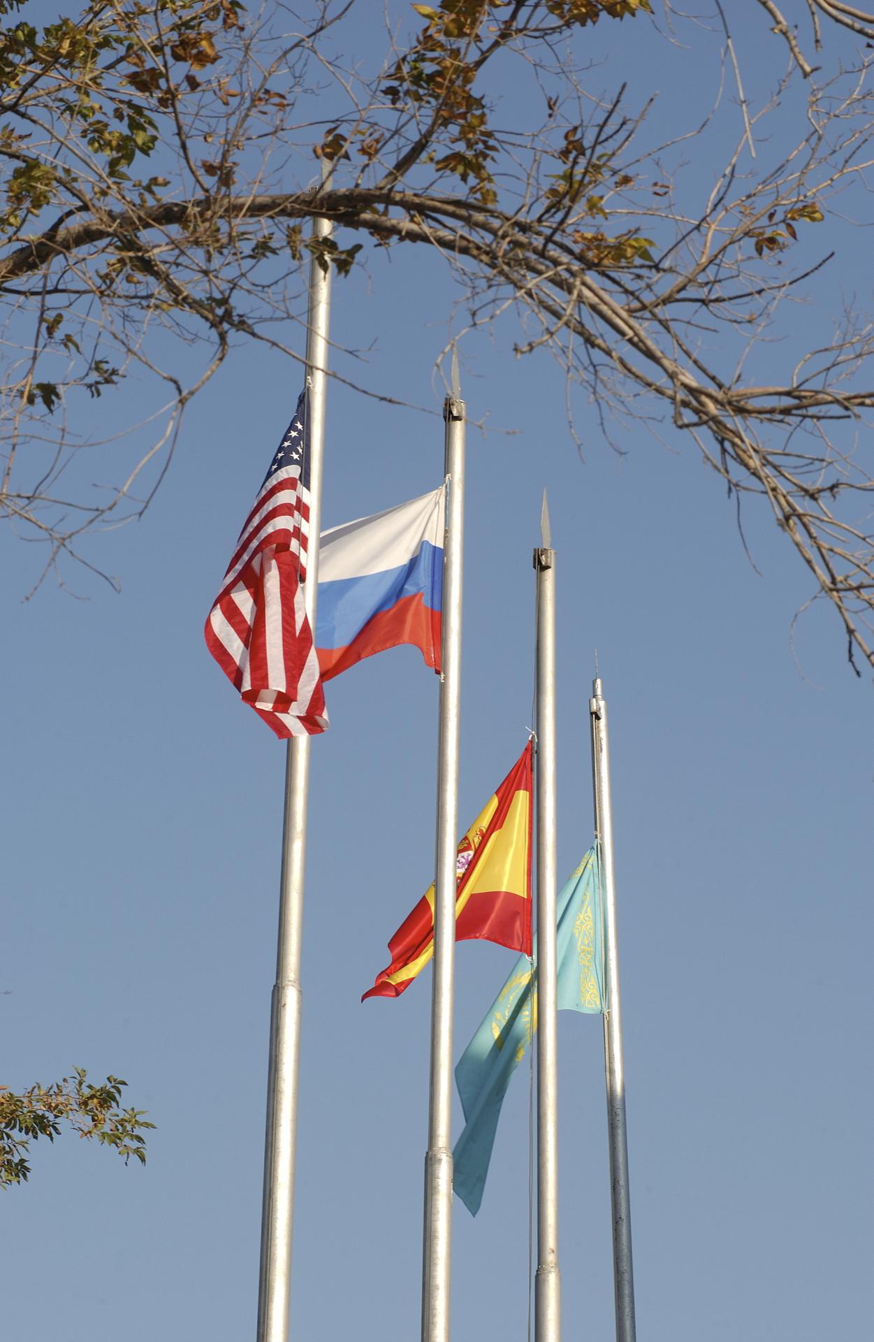 The flags of the United States, Russia, Spain and Kazakhstan fly outside the Cosmonaut Hotel, Tuesday, Oct. 14, 2003, in Baikonur, Kazakhstan following a traditional flag-raising ceremony. Photo Credit (NASA/Bill Ingalls)