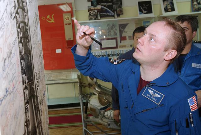 Flight Engineer and NASA Science Officer Mike Fincke prepares to sign a photograph in the space museum located at the Baikonur Cosmodrome, Wednesday, April 14, 2004, in Baikonur, Kazakhstan. Photo Credit: (NASA/Bill Ingalls)