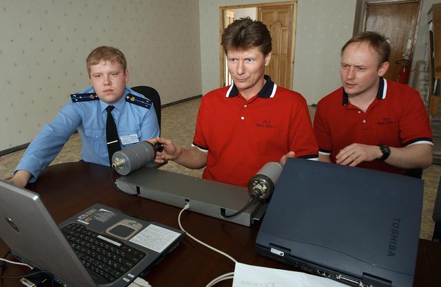 Expedition 9 Commander Gennady Padalka, center, trains on a Soyuz simulator while Expedition 9 Flight Engineer and NASA Science Officer Mike Fincke, right, watches at the Cosmonaut Hotel, Thursday, April 15, 2004, in Baikonur, Kazakhstan. Photo Credit: (NASA/Bill Ingalls)