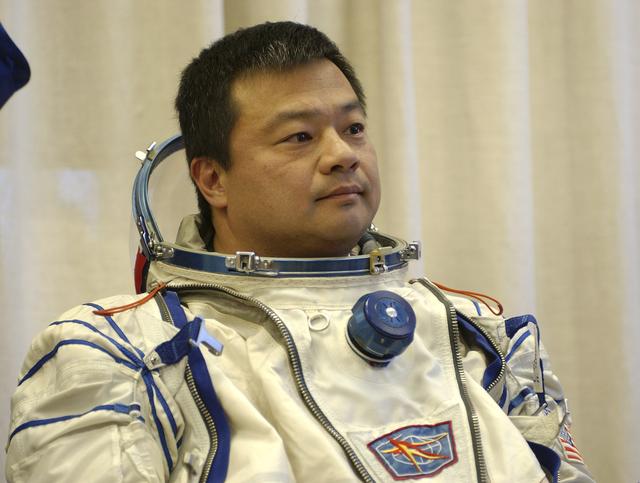 Expedition 10 Commander and NASA Science Officer Leroy Chiao donned his launch and entry suit and climbed aboard the Soyuz TMA-5 spacecraft Friday, October 5, 2004, at the Baikonur Cosmodrome in Kazakhstan for a dress rehearsal of launch day activities leading to their liftoff October 14 to the International Space Station. Chiao and Sharipov, the first crew of all-Asian extraction, will spend six months on the Station. Shargin will return to Earth October 24 with the Stations' current residents, Expedition 9 Commander Gennady Padalka and NASA Flight Engineer and Science Officer Mike Fincke. Photo Credit: (NASA/Bill Ingalls)