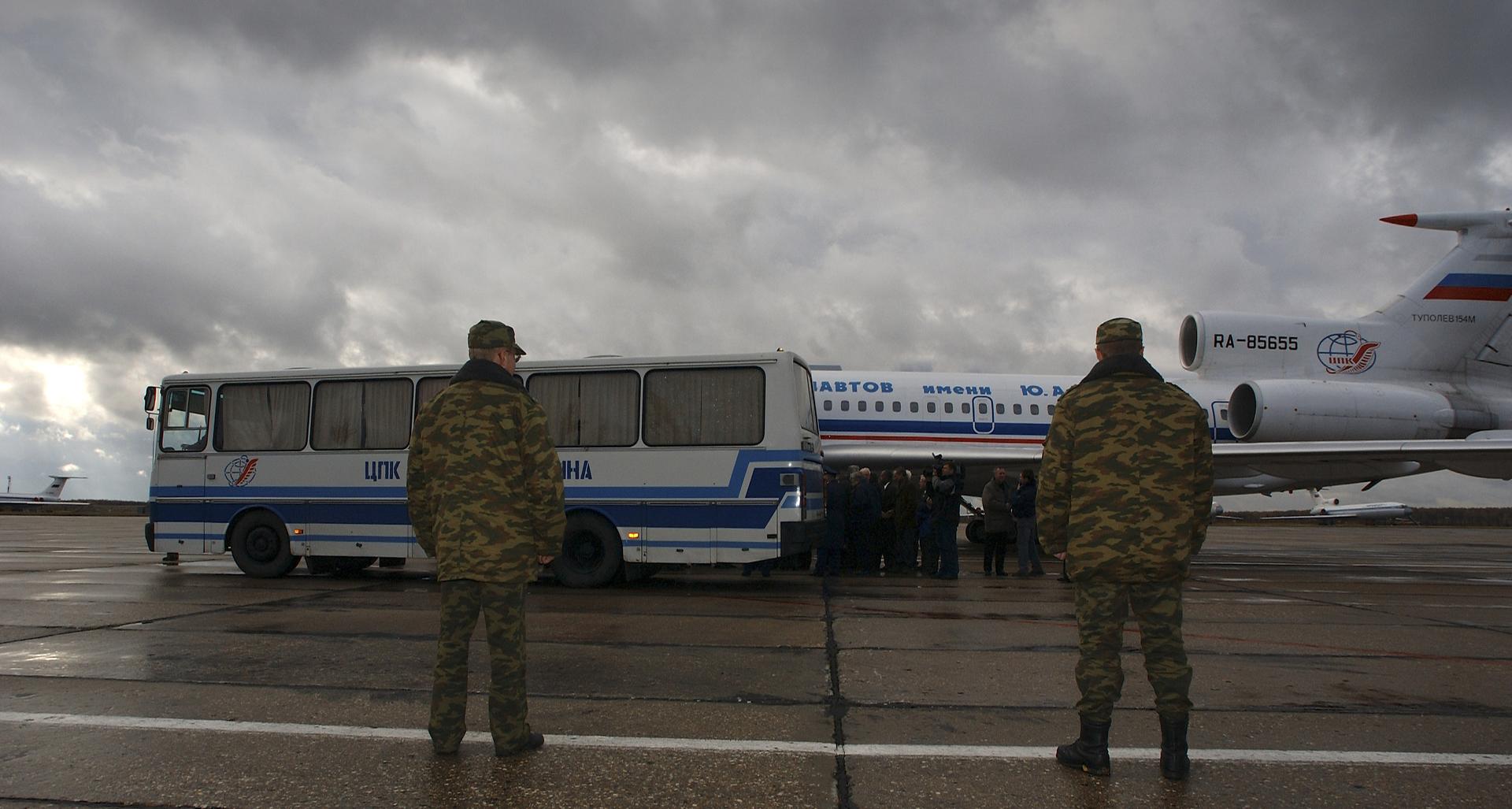 The crew return bus pulls away from the Gargarin Cosmonaut Training Center's airplane in Star City, Russia. The Soyuz capsule carrying Expedition 9 Flight Engineer Michael Fincke, Expedition 9 Commander Gennady Padalka and Russian Space Forces cosmonaut Yuri Shargin landed approximately 85 kilometers northeast of Arkalyk in northern Kazakhstan, Sunday, October 24, 2004. Photo Credit: (NASA/Bill Ingalls)