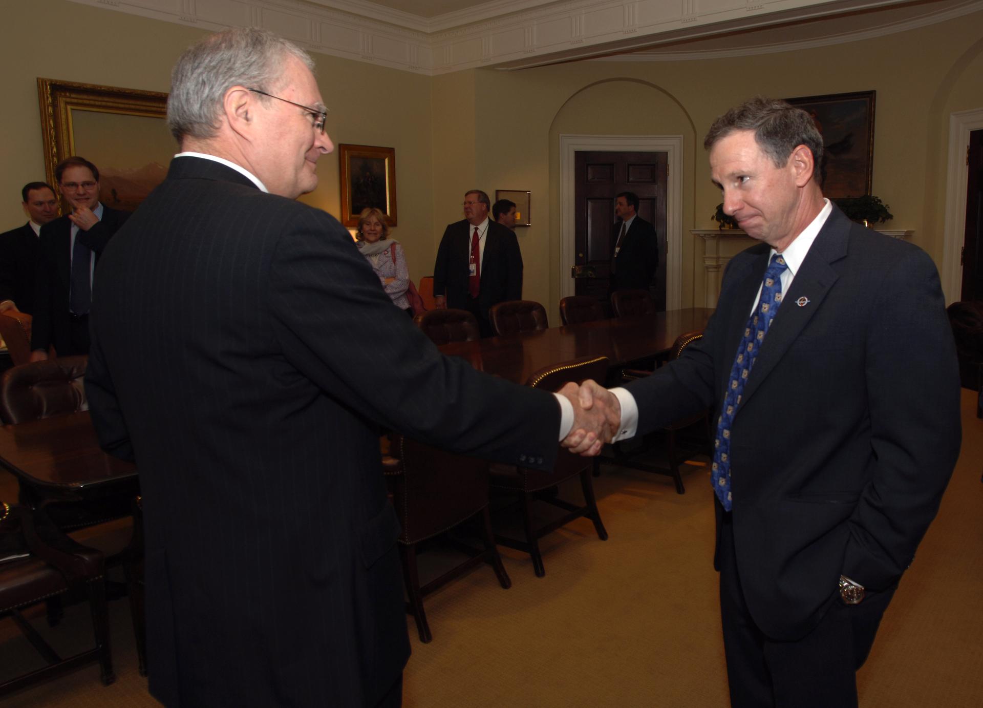 John H. Marburger, Science Adviser to the President and Director of the Office of Science and Technology Policy (OSTP), left, shakes hands with NASA Administrator Michael Griffin following his swearing-in, Thursday, April 14, 2005, in Washington. Photo Credit: (NASA/Renee Bouchard)
