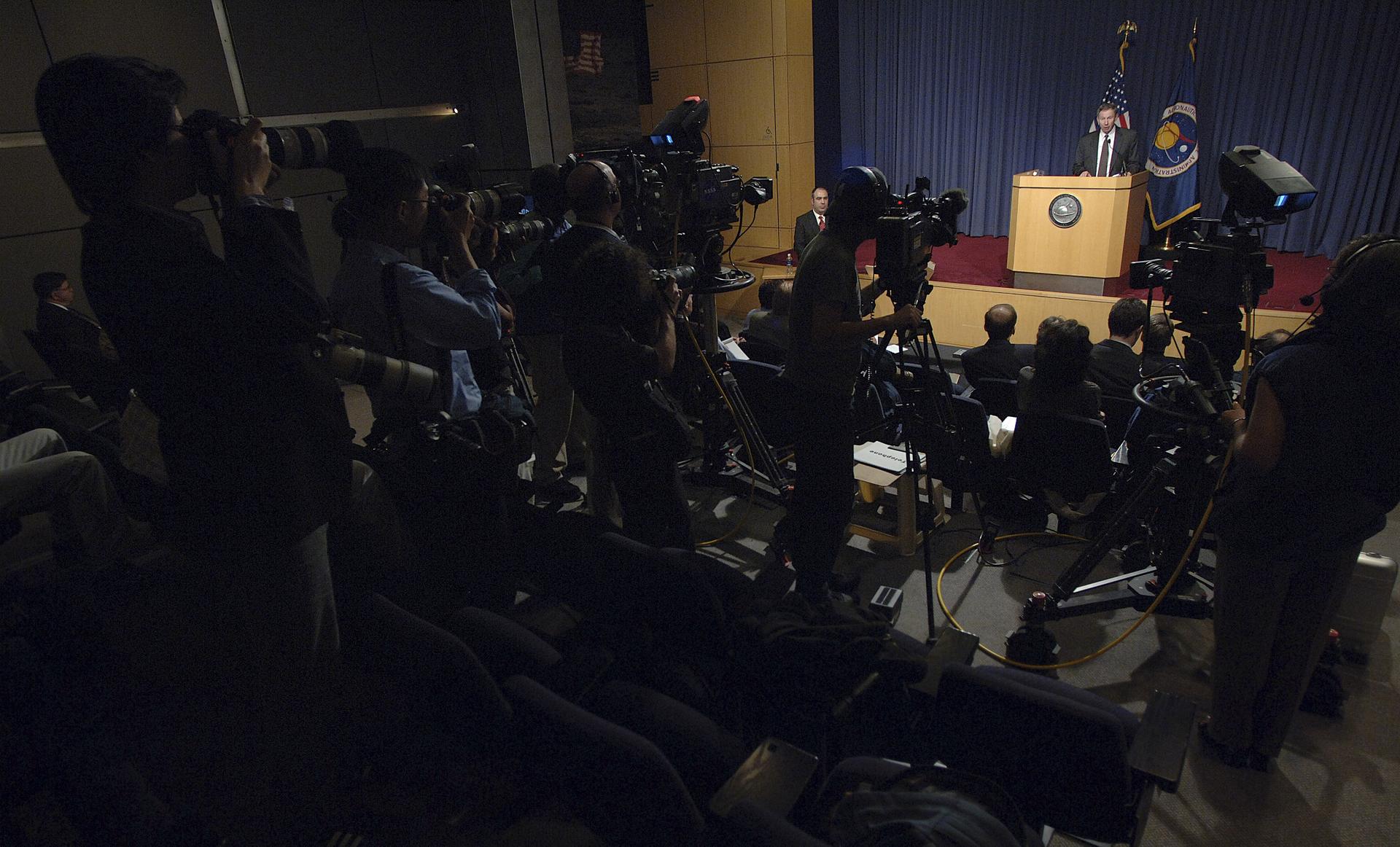 Michael Griffin addresses the media during his first press conference as NASA Administrator, Monday, April 18, 2005, at NASA Headquarters in Washington, DC. Photo Credit: (NASA/Renee Bouchard)