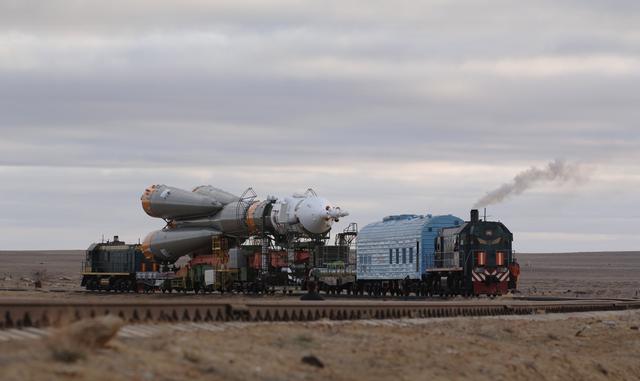 The Soyuz TMA-8 spacecraft and its booster rolled out to the launch pad on Tuesday, March 28, 2006 at the Baikonur Cosmodrome in Baikonur, Kazakhstan for final pre-launch preparations. The Soyuz will blast off on March 30, 2006 to carry Expedition 13 Commander Pavel V. Vinogradov and Science Officer and Flight Engineer Jeffrey N. Williams to the International Space Station for a six-month mission. The spacecraft will also be carrying Brazilian Space Agency Soyuz crew member Marcos Pontes, who will spend 10 days aboard the International Space Station under an agreement with the Russian Federal Space Agency. Photo Credit: (NASA/Bill Ingalls)